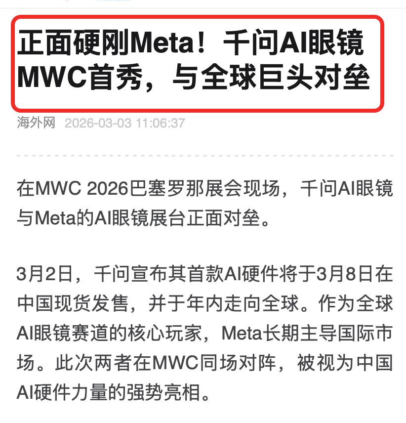 Meta:我的AI眼镜绝对是行业精锐! 千问:打的就是精锐! 3月2日在西班牙巴塞罗那举办的世界移动通信大会上,出现了有趣的一幕——中国第一AI眼镜品牌对阵美国第一AI眼镜品牌Meta! Meta AI眼镜展台对面就是千问AI眼镜的展台,并且千问AI眼镜的展台比Meta的更大,还竖起高达5米的“Qwen”巨幅标识,不管是在气势上还是在吸引广大用户方面都更胜一筹。 千问AI眼镜首次在全球亮相就挑了个硬骨头啃,直接硬刚Meta AI眼镜,主要还是技术实力确实顶,产品更有优势。 国外的博主在测评两家AI眼镜的结果很有说服力。 这位海外博主表示:Meta AI 眼镜就是一个带着扬声器的相机,而千问AI眼镜不仅能录视频,还能思考。 严格意义上来说,AI眼镜要的就是AI的思考能力,从而让普通人使用它的时候更方便快捷。很显然在这方面千问AI眼镜做得更出色。 实际上,千问AI眼镜能做到技术领先,主要还是因为千问AI眼镜走的路子是千问AI大模型+千问AI助手+顶级硬件设施三位一体的黄金组合。 这三者不管哪一个拿出来,都是行业内顶尖的存在,所以现在敢硬刚Meta,其实是千问实力到位的体现。 只能说,中国科技崛起已经势不可挡了,过去由欧美统治高科技产品的时代要一去不复返了!