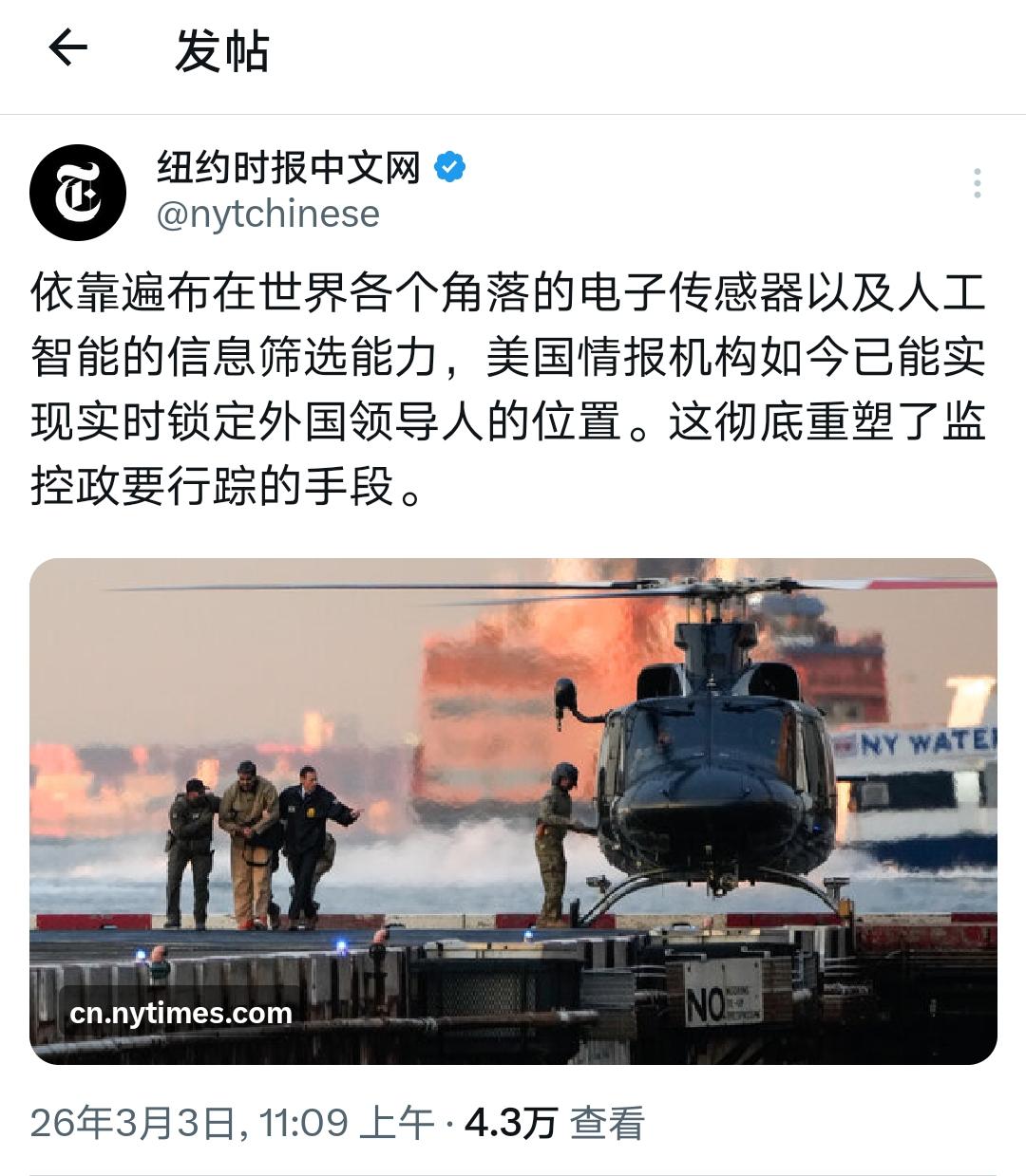 纽时实锤:美国制造 = 行走的电子间谍 纽时报了个 “大瓜”: 依靠遍布全球的电子传感器和 AI 筛选能力,美国情报机构已能实时锁定外国领导人位置,彻底重塑了监控手段。 说几句: 纽时这波操作,等于向全世界宣告:任何贴着 “美国制造” 标签的电子产品,本质上都是美国安插在全球的 “电子间谍”。 电子监听本不是新鲜事,但由美国主流媒体亲自下场爆料,这到底是跟白宫有仇,还是“红蓝宫斗”太上头? 就问一句:谁敢买Jensen Huang的芯片? 果然,没有一个绰号是白给的。 《纽约时报》,以后请叫它——纽钴禄・建华。没毛病! Source: X