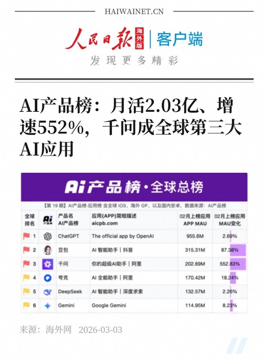 全球AI的竞争格局,正在因为中国应用的崛起而发生剧变。 3月3日的最新数据显示,全球MAU排名前三的AI应用,中国已占两席。其中,千问以2.03亿MAU和552%的全球第一增速,超越Gemini,更是直接威胁到了ChatGPT的统治地位。 很多人问,为什么是千问?为什么它能跑赢全球那么多竞争对手?答案就在“生态位”这三个字里。千问通过春节期间的“一句话下单”,成功切入了生活服务的核心地带。 从QuestMobile的数据看,千问在春节期间的表现堪称惊艳:DAU从707万暴涨至7352万,增幅940%。这不仅是简单的用户获取,这是一次大规模的用户心智教育。1.3亿用户在千问上订票、买奶茶、点外卖,意味着他们已经认可了“AI办事”这种全新的交互逻辑。 这种逻辑是Gemini等海外模型短期内无法复制的。Gemini虽然技术强劲,但在中国这样极其碎片化、高并发的服务场景中,千问积累的实战经验具有不可替代性。2亿次的累计下单,是数亿次真实指令的磨练,这让千问在语义理解和意图识别上,更贴合中国人的习惯。 目前的中国AI市场,千问和豆包的日活已稳定在4000万量级。这种“双雄并立”的局面,预示着中国AI已经从技术追随者变成了应用引领者。 当千问以全球增速第一的姿态向ChatGPT发起冲击时,它背后站着的是1.3亿真实办事的活跃用户。这种由庞大真实需求喂养出来的AI应用,才是全球竞争中最具生命力的存在。