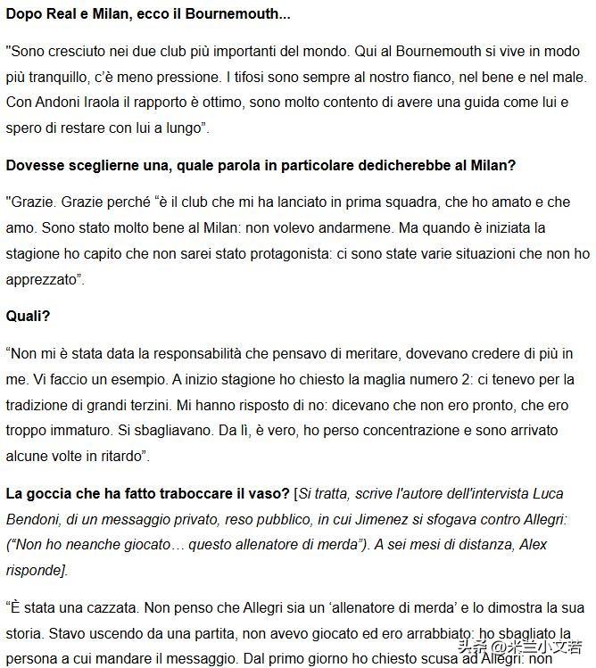 希门尼斯谈离开米兰。这是希门尼斯首次聊到离开米兰背后的故事。希门尼斯表示感谢米兰给予我的一切,阿莱格里是一位优秀的教练。 这个孩子也是话唠,要不然就不说要不然就说那么多,孩子大概意思是感谢米兰给予一线队机会,之前爱米兰,现在依然爱米兰,永远都会祝福米兰,离开米兰是因为一时冲动,俱乐部与主教练并没有要求我离开,我与阿莱格里之间没有嫌隙,他是一位伟大的主教练,我发的信息只是一些愚蠢的发泄,阿莱格里的履历足以证明他的伟大。 那条骂阿莱格里的信息确实是真实存在的,所以说小道消息有时候真的是靠谱的,很多人都不相信希门尼斯骂了阿莱格里,其实有啥不相信的,他作为皇家马德里俱乐部的太子爷离开皇家马德里俱乐部就是因为与劳尔互喷,其实不准确,主要是他喷劳尔,劳尔在皇家马德里啥地位,希门尼斯都没放在眼里,阿莱格里正常。