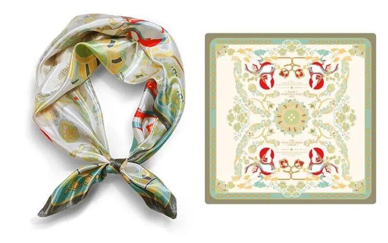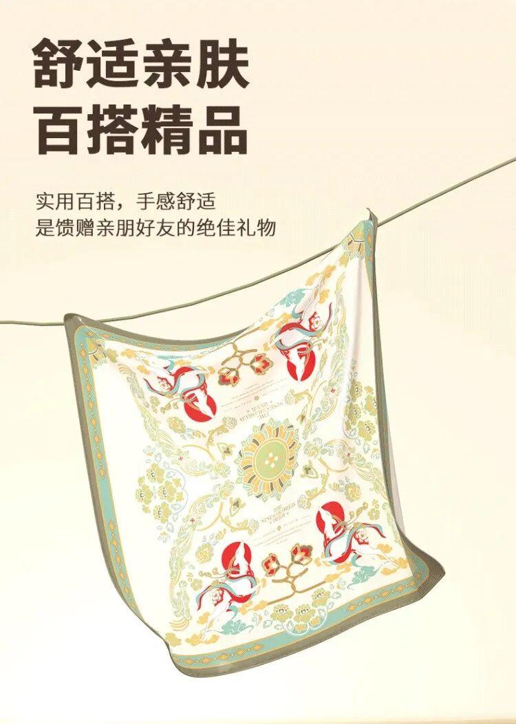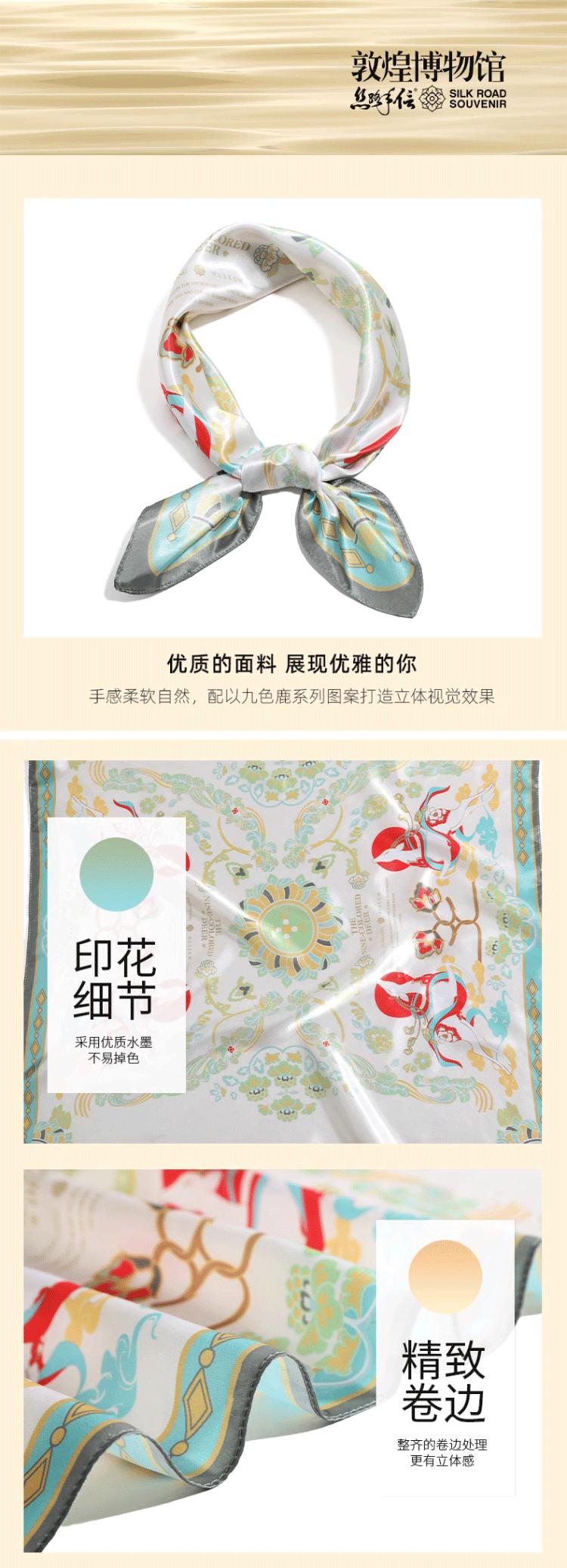 这款丝巾以敦煌壁画九色鹿传说为设计蓝本,还原九色鹿矫健俊朗的灵动身姿,每一处细节都精心雕琢,鹿角的细腻纹理、鹿身的斑斓色彩栩栩如生,将敦煌壁画的艺术美感复刻于方寸之上,一眼便沦陷于这份跨越千年的视觉惊艳。