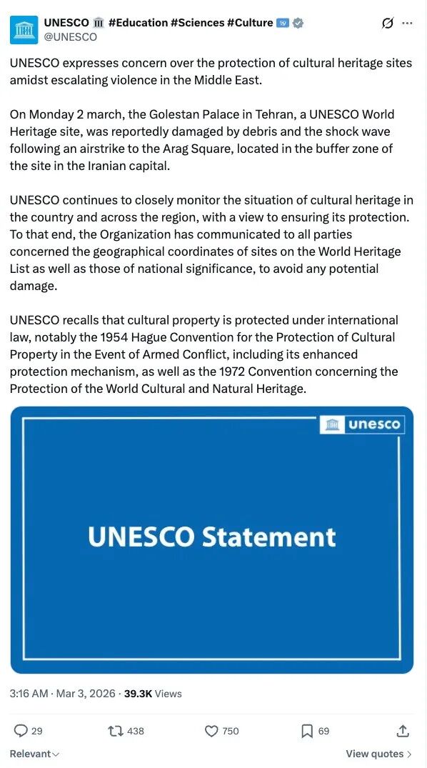 北京时间3月3日,联合国教科文组织(UNESCO)在社交媒体上发布声明,也证实了戈勒斯坦宫确实于3月2日遭到空袭后受碎片及冲击波影响被破坏,“对中东地区不断升级的暴力局势中,文化遗产遗址的保护问题表示关切。”