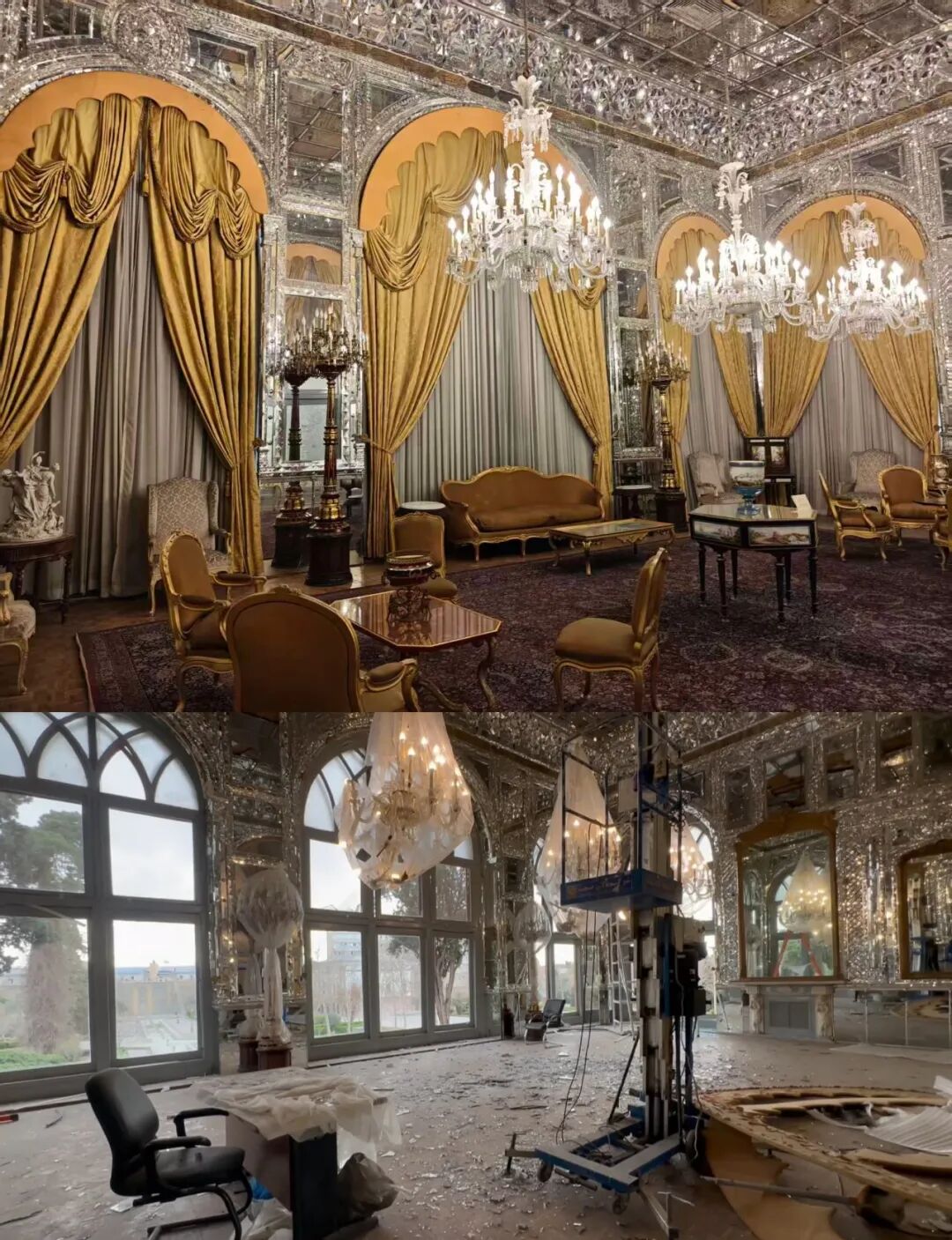 然而,看到戈勒斯坦宫受损的现状,她回去比对了旅行时拍的照片,忍不住叹气,“意识到这两个房间是同一个地方,新的震撼。”狐女士推测,“看起来是二楼的每个房间都炸烂了,镜子镶嵌工艺没法拆,给炸坏了。”