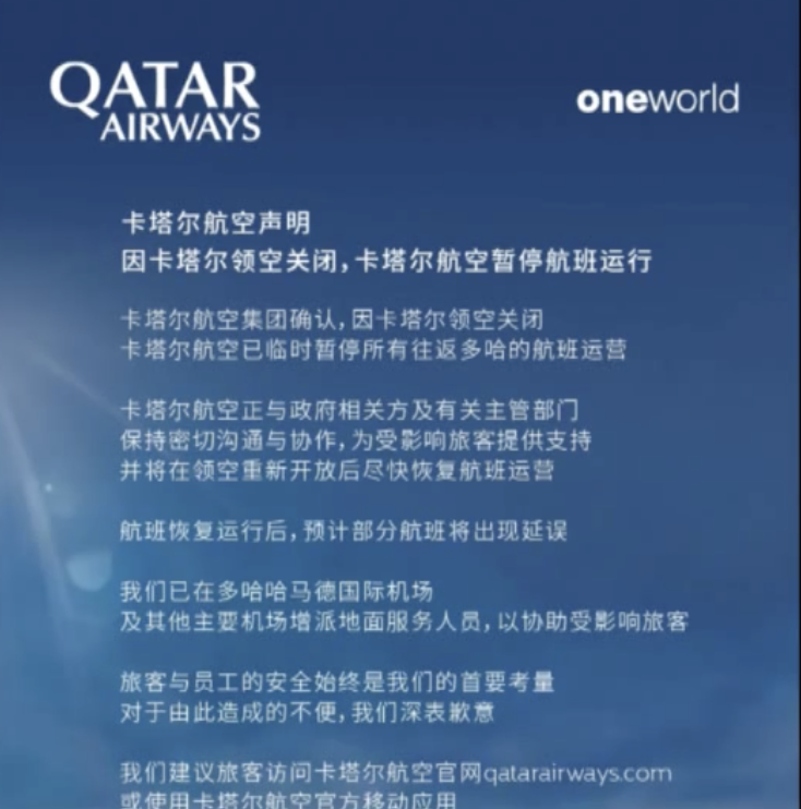 随着局势恶化,2月28日,以色列机场管理局称,已关闭以色列领空对民用航班的开放,呼吁公众不要前往以色列机场。卡塔尔、阿联酋等多个国家领空随后也依次宣布关闭领空或部分领空,航班取消。卡塔尔航空发布公告称,因卡塔尔领空关闭,卡塔尔航空暂停航班运行。