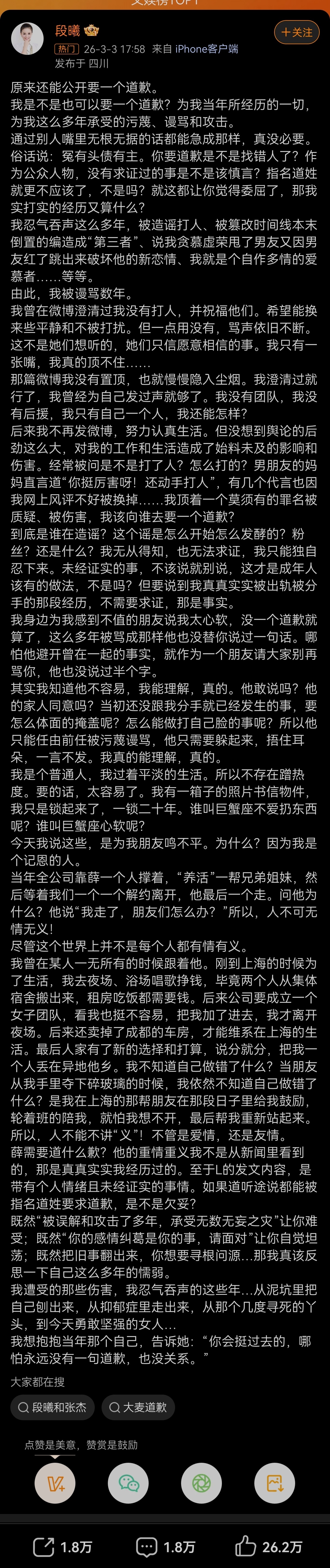 张杰前女友 被出轨是事实 段曦发文控诉,称当年被出轨是事实,多年来遭受污蔑谩骂却无人澄清。她质疑谢娜要求薛之谦道歉的同时,谁来向她道歉?并力挺薛之谦重情重义。娱乐圈这瓜把中东热点都压下去了,波斯人打仗不行,造流量也不行。