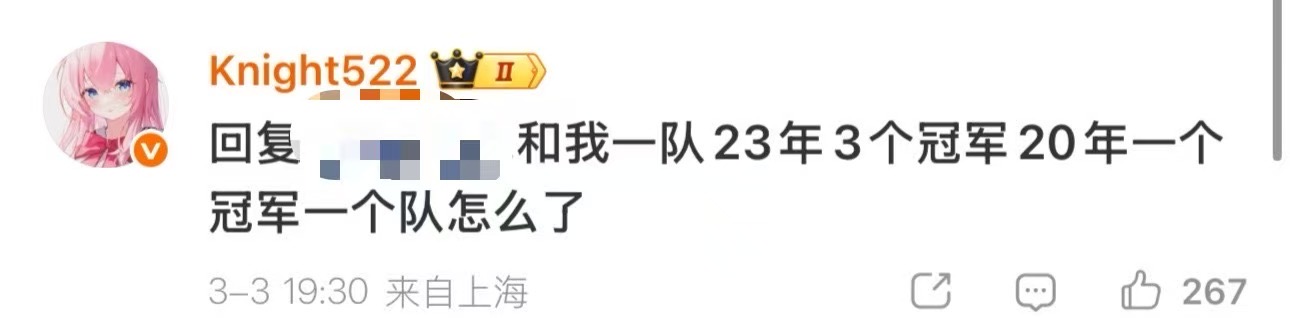 Knight回复网友:和我一队23年三冠20年一冠,一个队怎么了