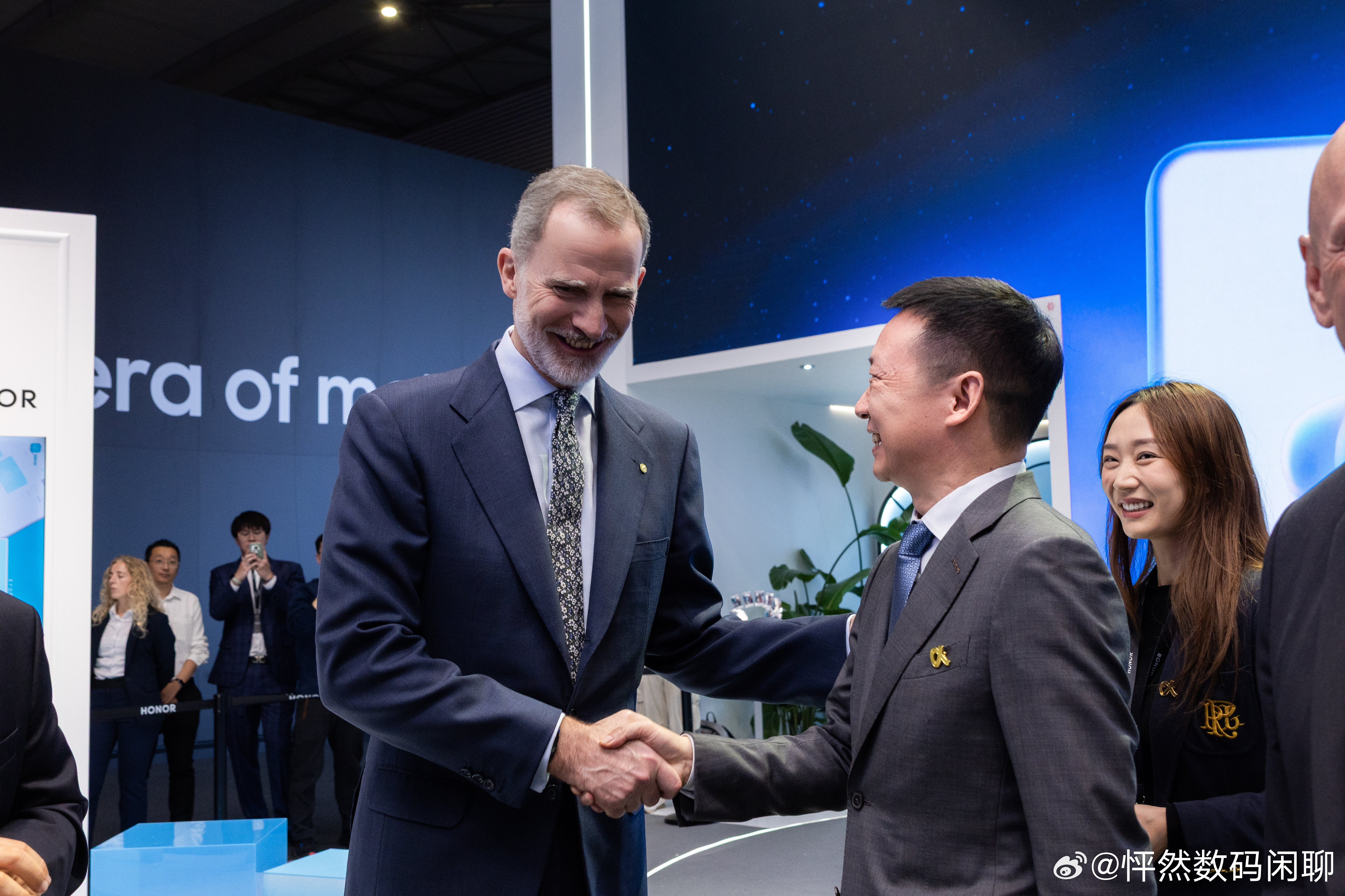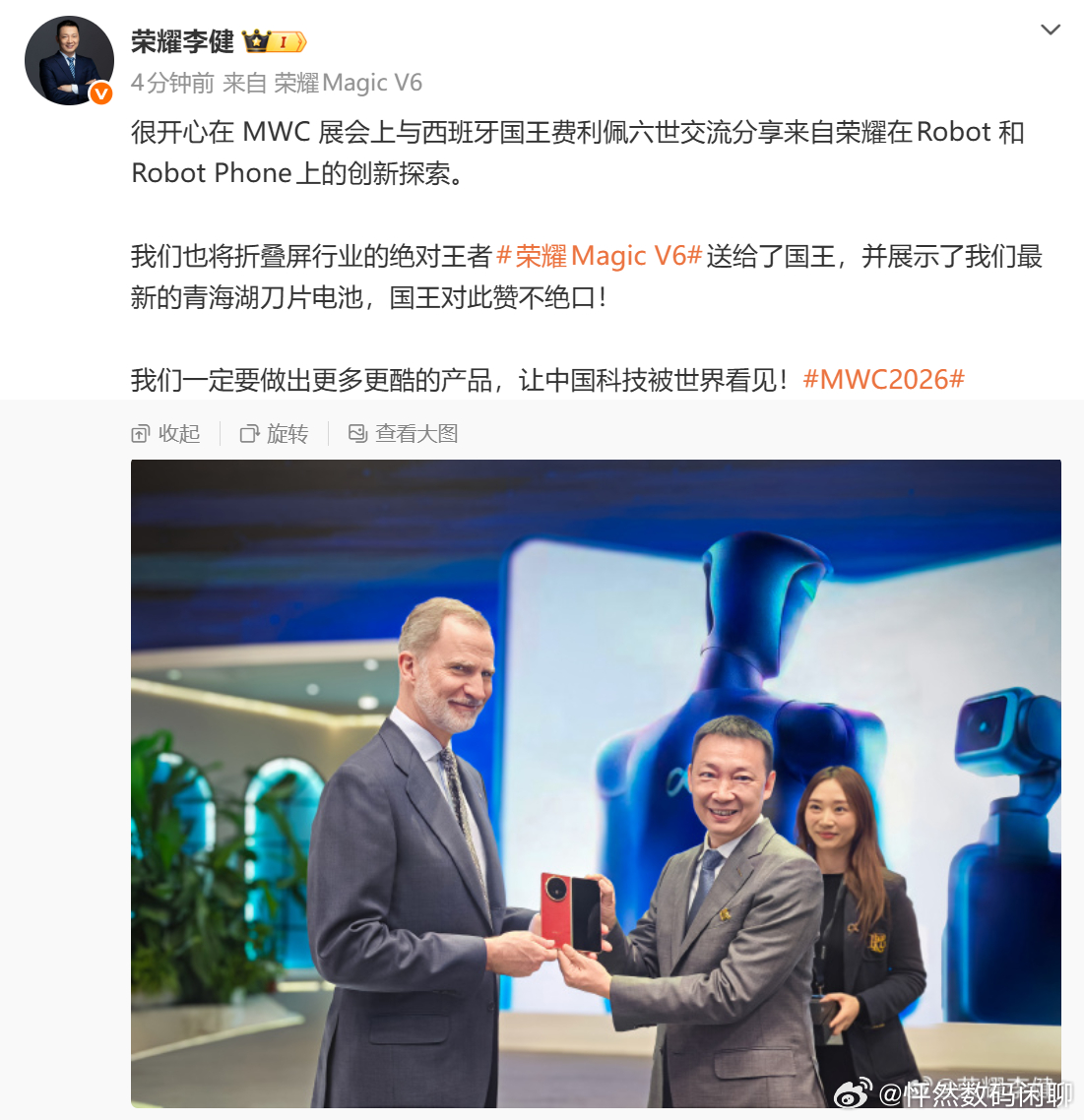 昨天在MWC展会现场,西班牙国王来到荣耀展台,体验最新发布的荣耀Magic V6,对搭载刀片电池的荣耀Magic V6折叠屏手机表示惊叹。荣耀CEO李健现场赠送了一部荣耀Magic V6给西班牙国王。中国创新产品再次闪耀MWC,获得全球媒体大加称赞。这两天荣耀展台的折叠屏展区被围得水泄不通,国产折叠屏荣耀Magic V6获得国王点赞,又了给外国人亿点点震撼。期待国内发布!