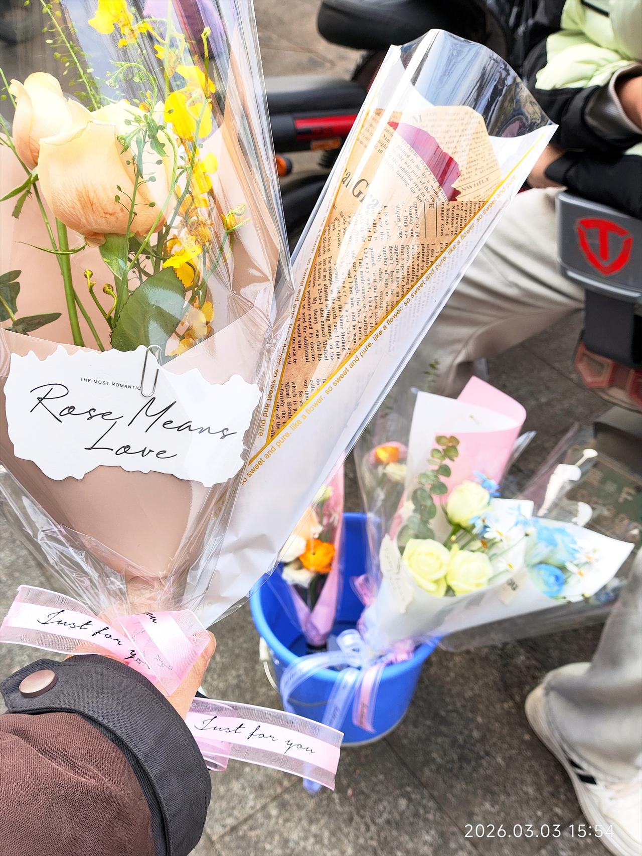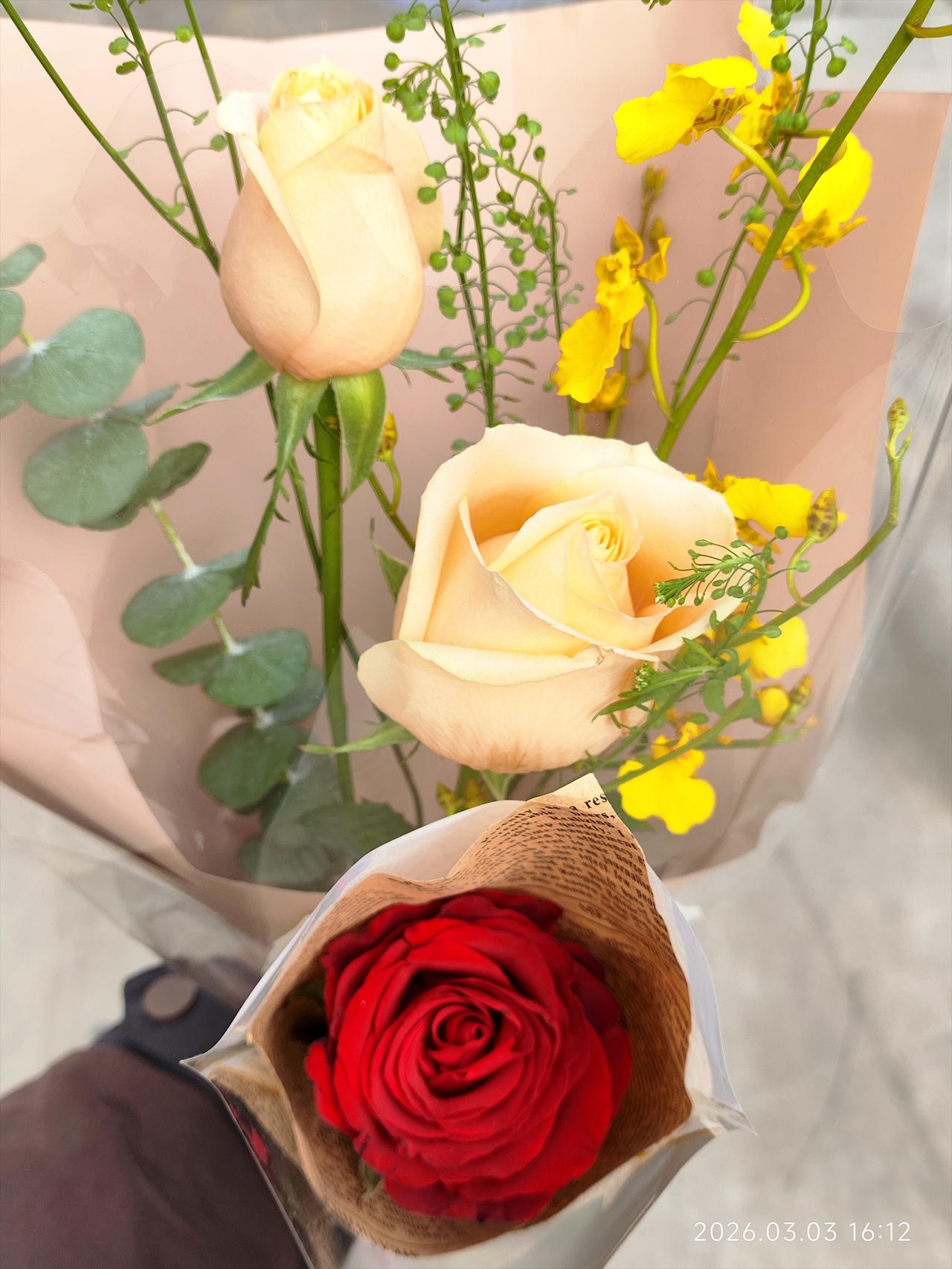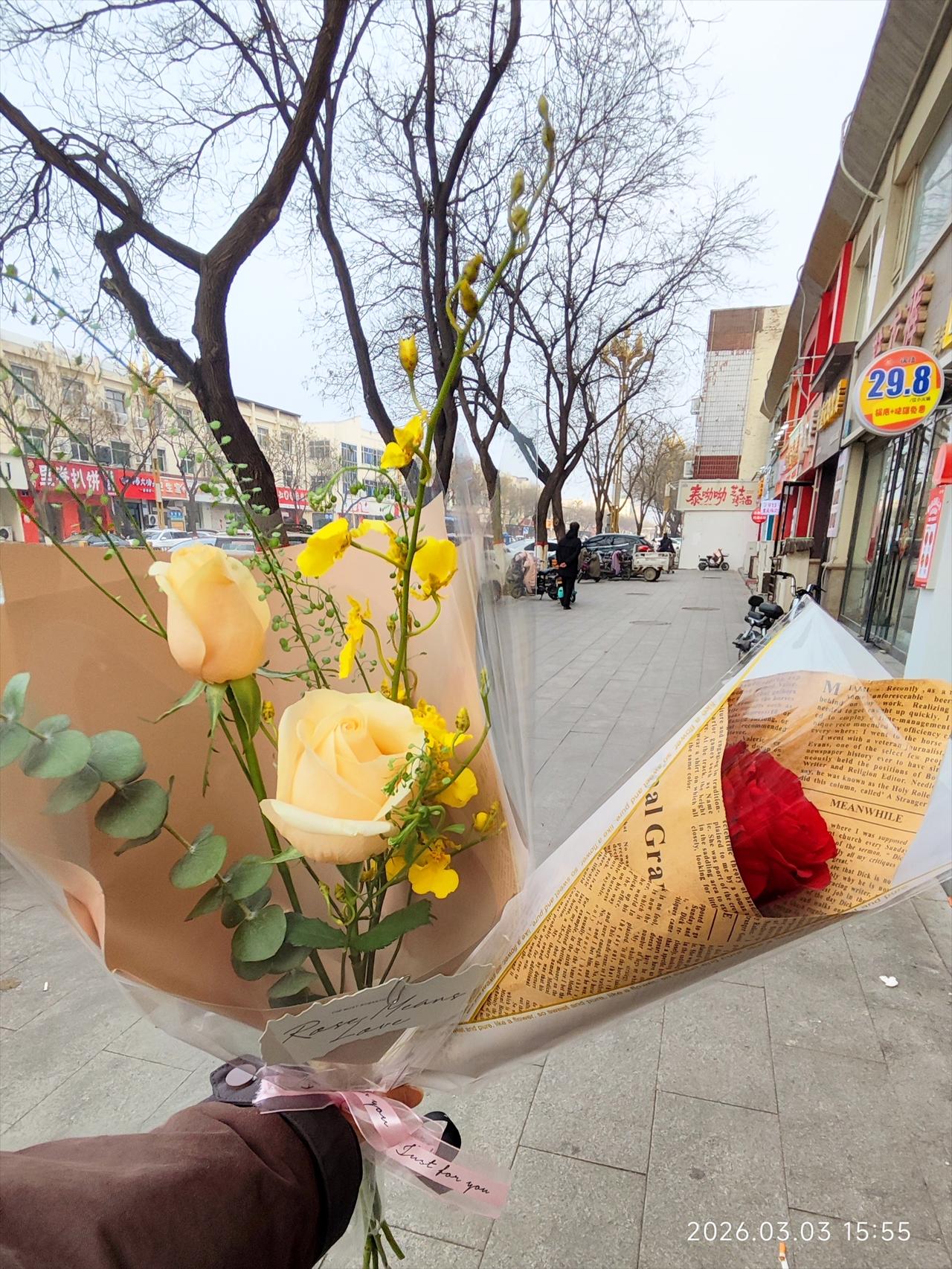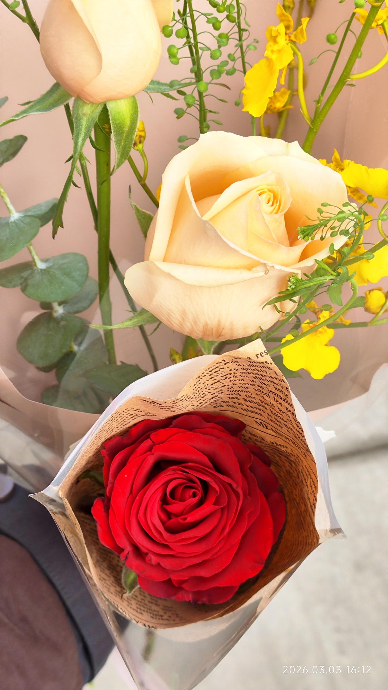 43岁中年妇女,收到街头陌生小伙送的一朵红色玫瑰花。 下午写完文章,想出去透透气。 女儿刚补完作业,累了两天,她不想出门,我就自己出去了。 我出门打算的好好的,取快递,买小蛋糕,买杯咖啡,去买馒头,买菜。 结果蛋糕店里排长队,咖啡店里人特别多,步行街好多路边摊,满满的都是人。 我去零食店给女儿买零食,也有好多人排队。 难道这是开学前的狂欢? 明天孩子就要去上学了。 我本来打算去尝尝瑞幸咖啡怎么样,但是店里人也挺多。 我就想算了,改天我再来吧。 咖啡店门口有一个小伙子,坐在电动车上,他面前放着一个桶,上面插着几束花。 我就看了一眼。 他问我要买花吗? 我问多少钱,他说9块9一束。 因为我没有打算来买花,我就犹豫了。 本来想等着进店买咖啡,就在那里站了一小下。 然后这个小伙子拿出桶里的一只红色玫瑰花,说送给我。 我以为我没听清,我惊讶地看着他。 他说你要吗?送给你。 我说,这不是9块9一朵吗? 有可能这朵花已经开了,他大概意思说这个可能不用9块9了吧。 我想要的话,他就送给我。 那多不好意思。 我说既然这样的话,那我就买一束花,你再把这朵红玫瑰搭给我吧。 然后我9块9买了他另外一束花,他把这朵红玫瑰就送给我了。 拿着花买其他东西也不方便了,我就干脆回家吧。 虽然意外的花了9块9,但一路上我都特别开心。 人还是要多走出去,才能遇到有趣的故事啊。