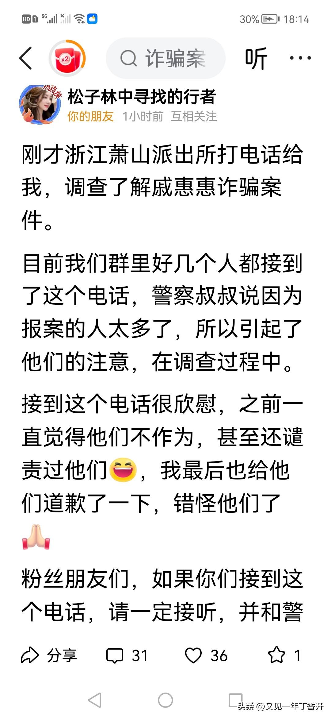 被骗的捐款的这几天注意一下 松子林中寻找的行者发布的小作文去看看,她说浙江萧山方面派出所已经联系她了,开始调查那个帅妈诈骗案了。 其实打假不容易,别说个人,就是官方在网上收集证据都很难,所以松子林美女她们能勇敢的站出来我是很佩服和支持的,我也是因为一位同乡姐姐才站出来支持的。 我转发文章我看不见,别人似乎也看不到,只能截图发布。 一开始的架势要不了了之,可能是退回捐款就可以了,但是追究的多了就反响比较大。 我也觉得官方应该有个结论,要么这些勇敢揭发的很容易被反扑,还有几个死铁粉拿出坚信不疑的样子,什么泰山压顶不弯腰,我以为是我就这样,管你真假我就沉迷在我自己的偏执里。这种我离得远远的,你倾家荡产关我啥事? 各人自扫门前雪,莫管他人瓦上霜。这也是我奉行的原则,反正我看的清,但是我不忍心那些勇于担当的人受伤,仅此而已!
