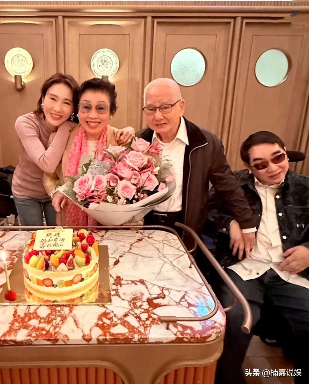黎姿晒和爸爸妈妈的全家福,庆祝妈妈八十大寿。 黎姿是香港有名的大美人,五十好几了