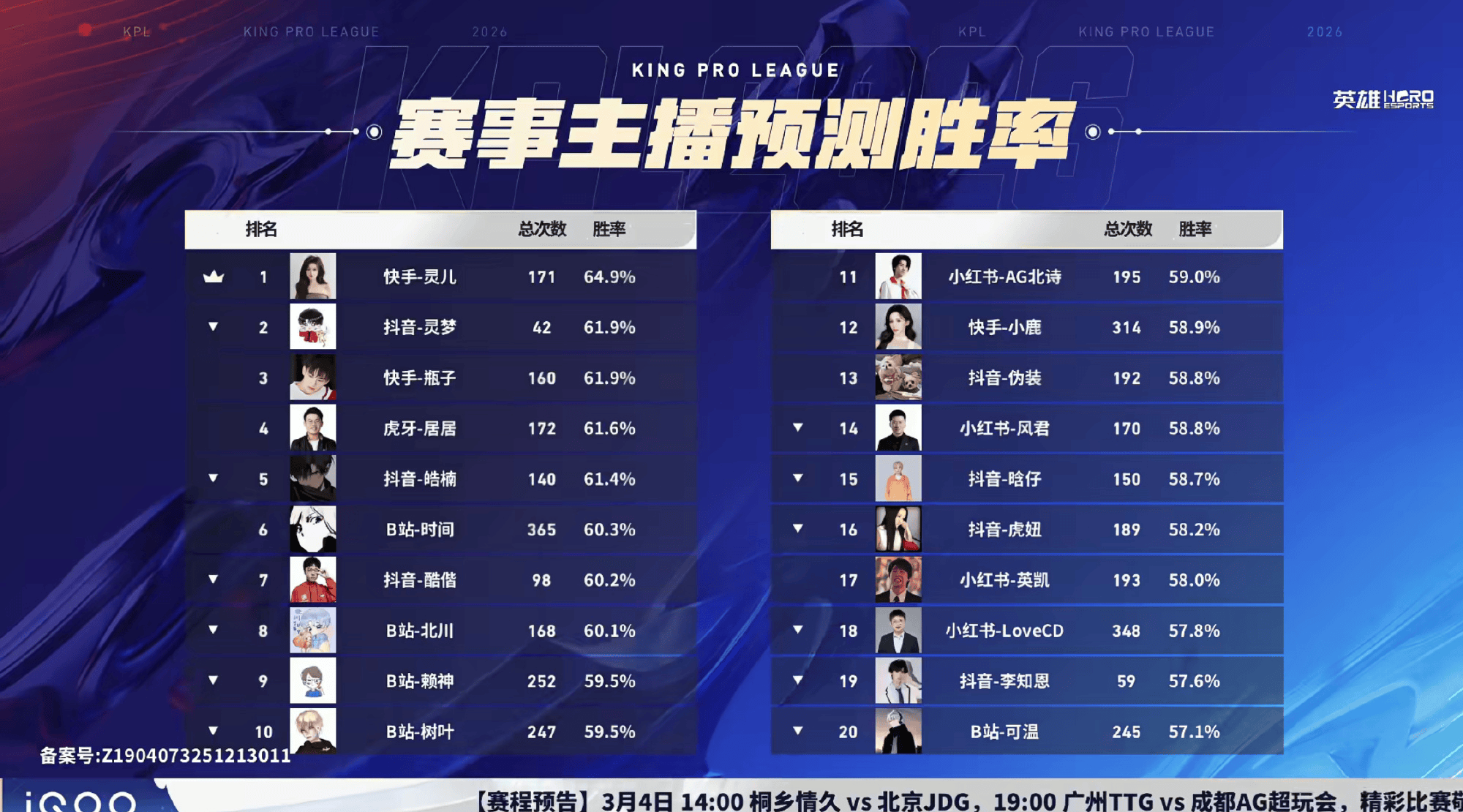 快手-灵儿胜率64.9%,位于排行榜第一。