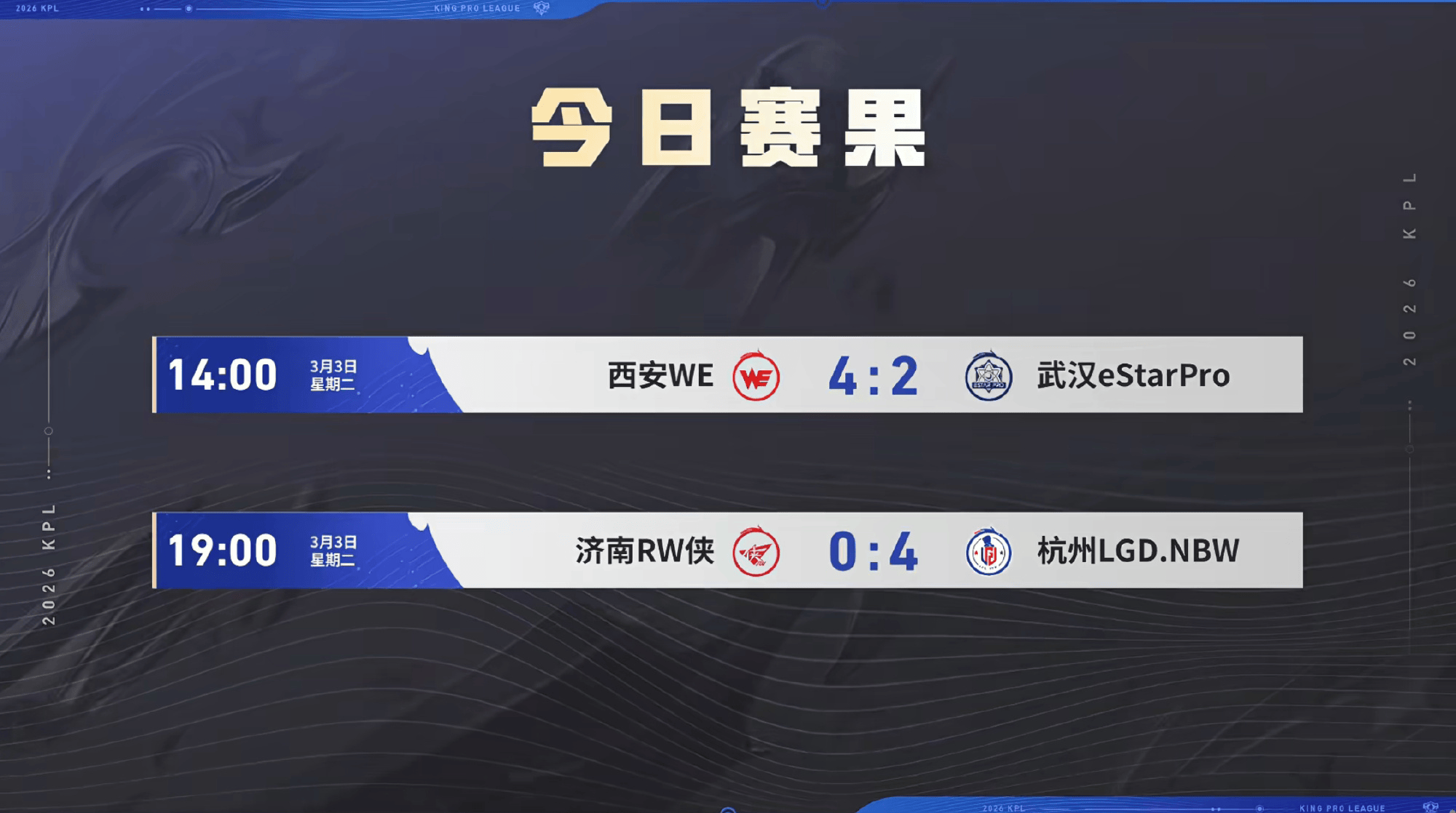 武汉eStarPro、济南RW侠遗憾无缘2026KPL春季赛常规赛第三轮及季后赛。