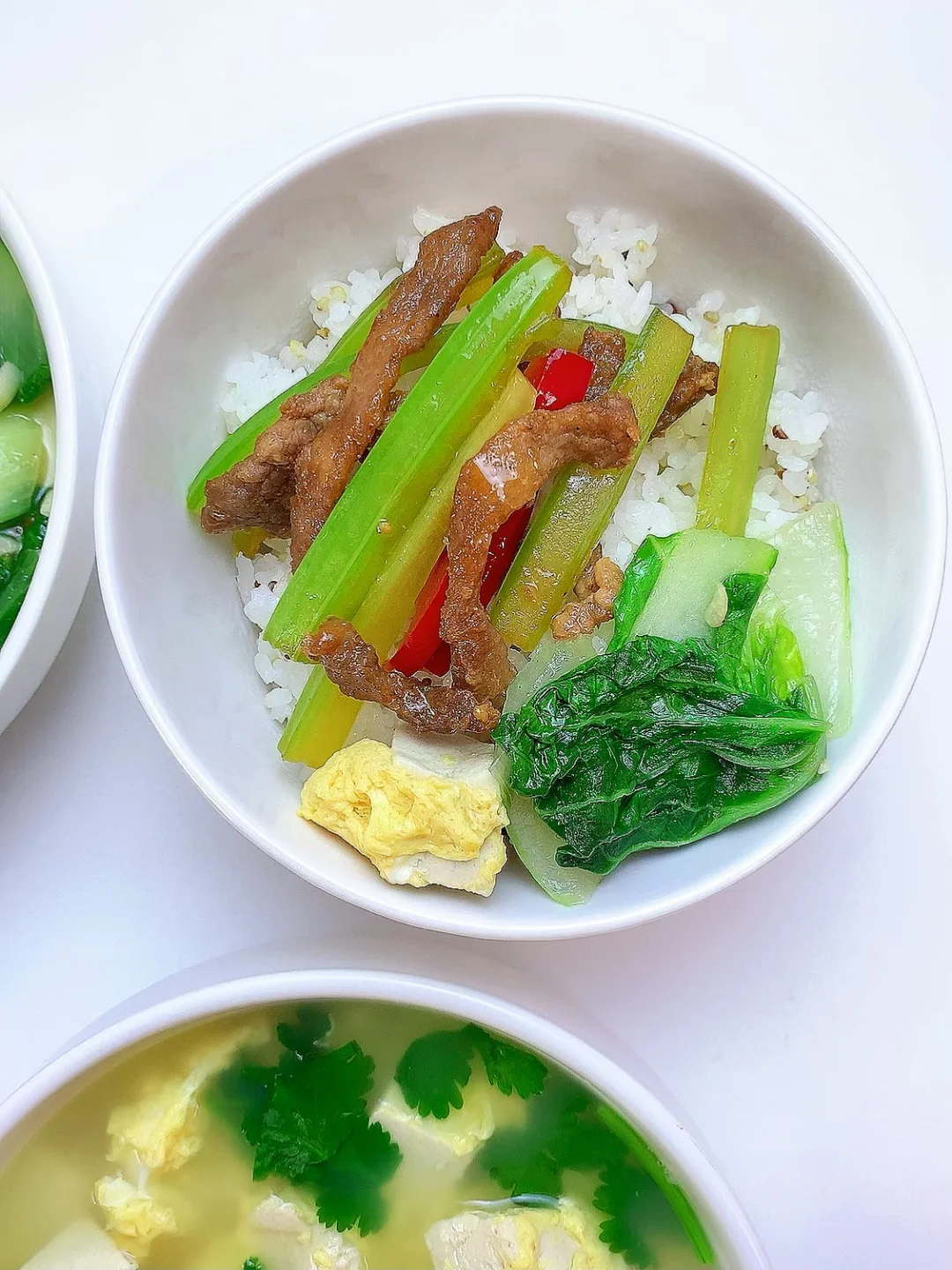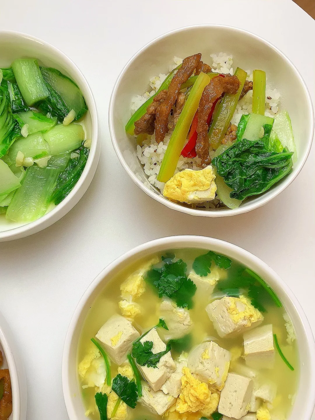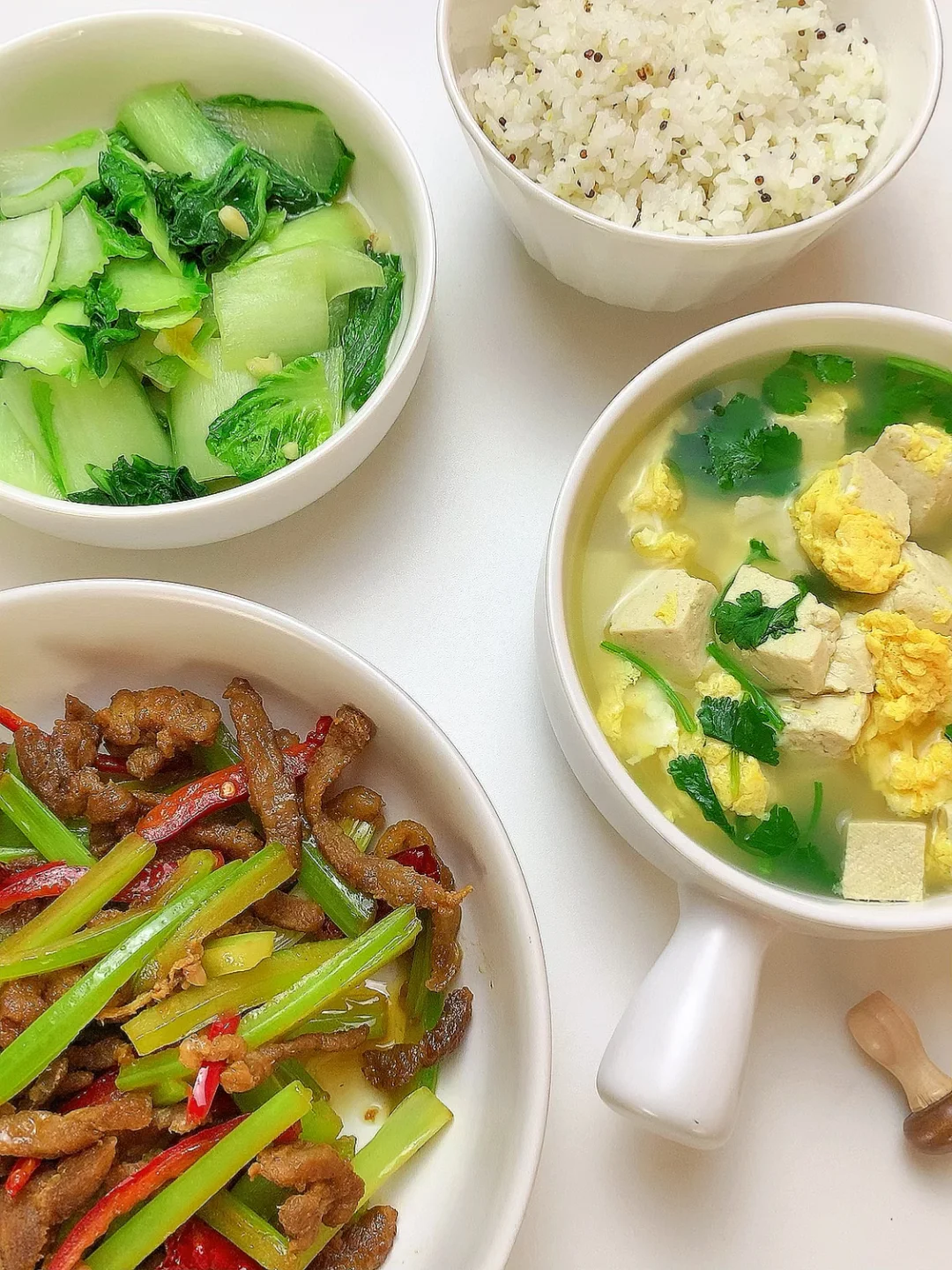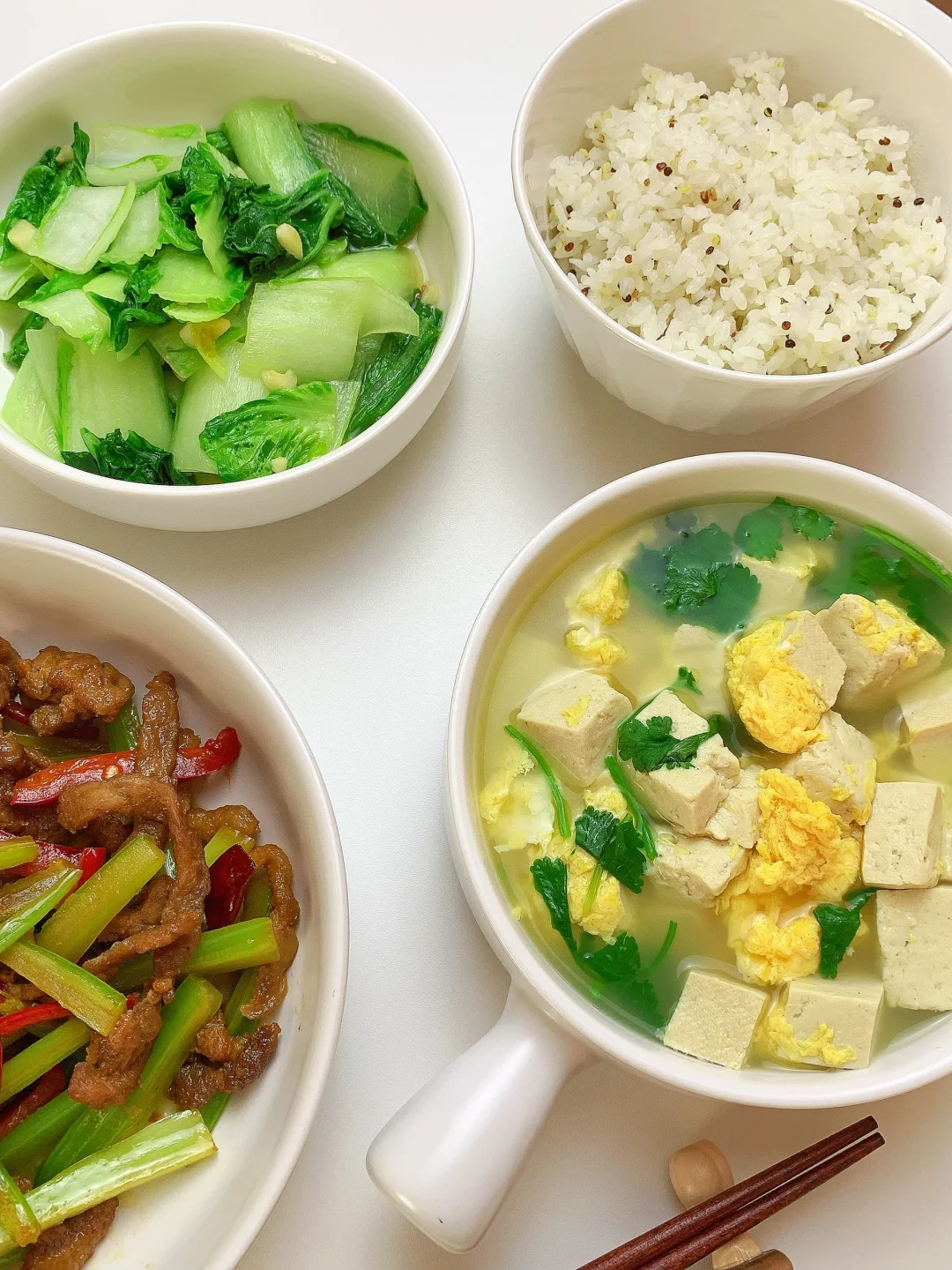 杂粮主食 + 纯肉蛋白菜 + 素蛋白蔬菜汤 + 高纤维生素菜
