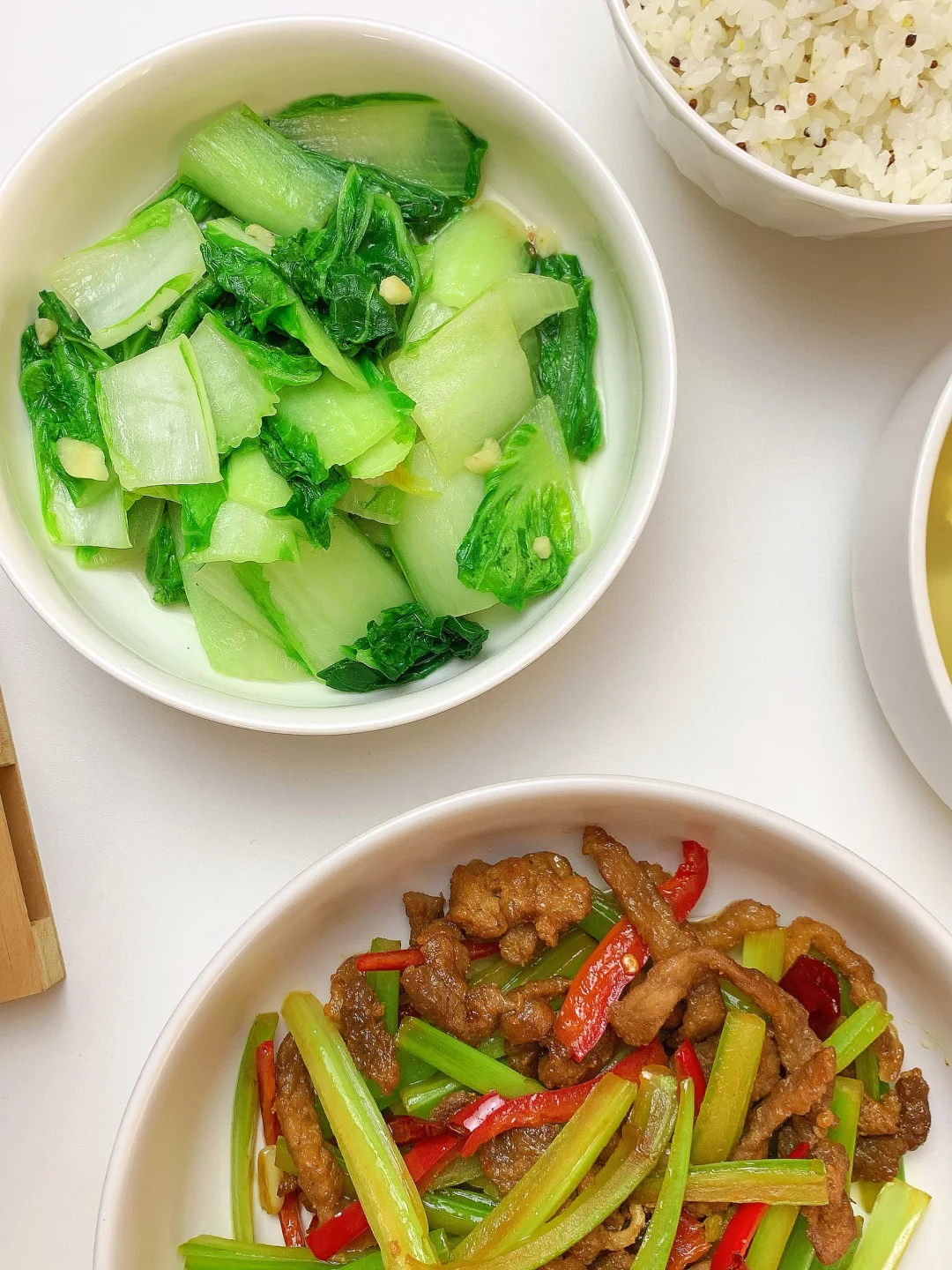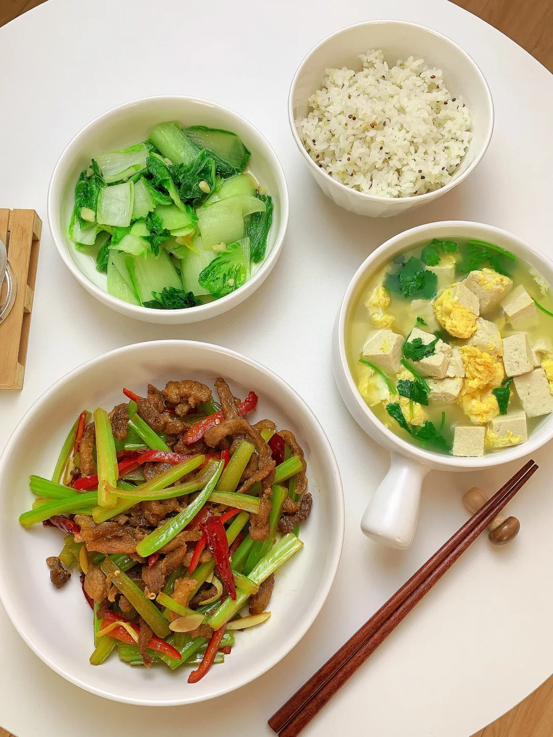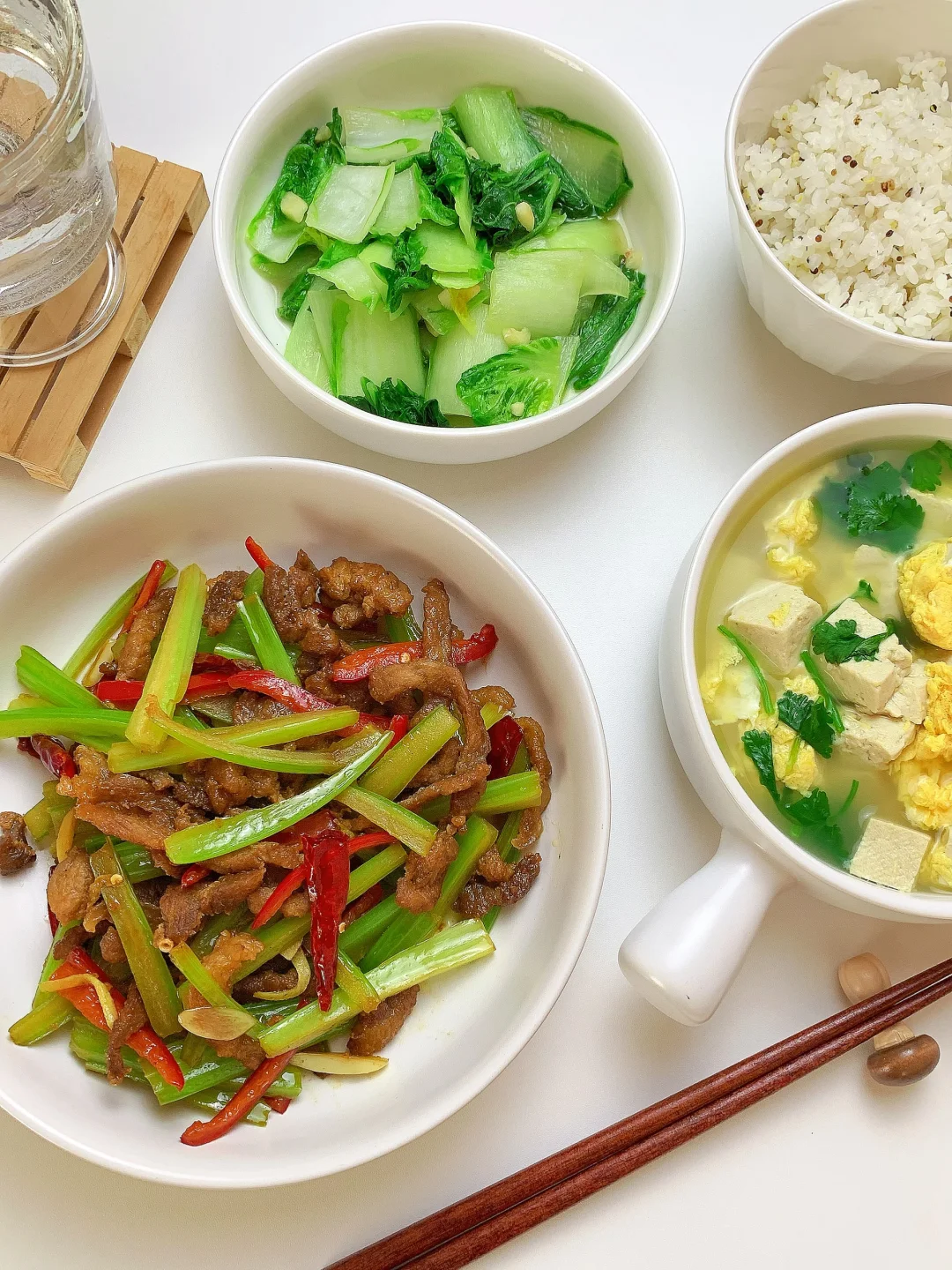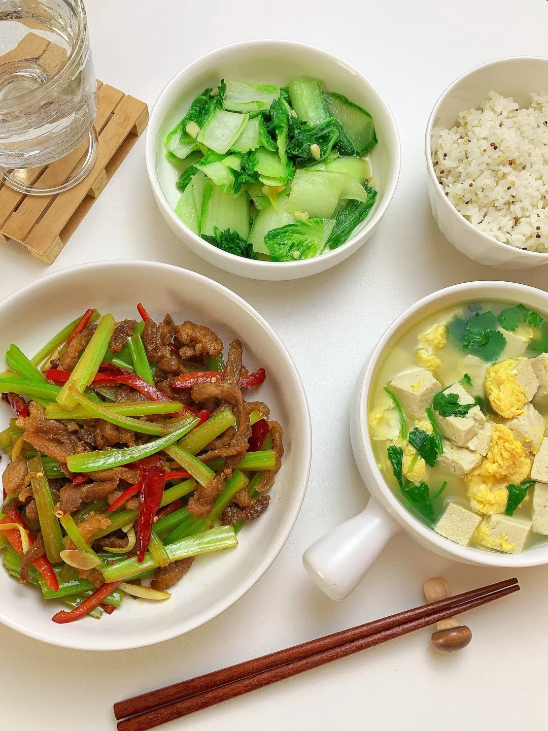 杂粮主食 + 纯肉蛋白菜 + 素蛋白蔬菜汤 + 高纤维生素菜