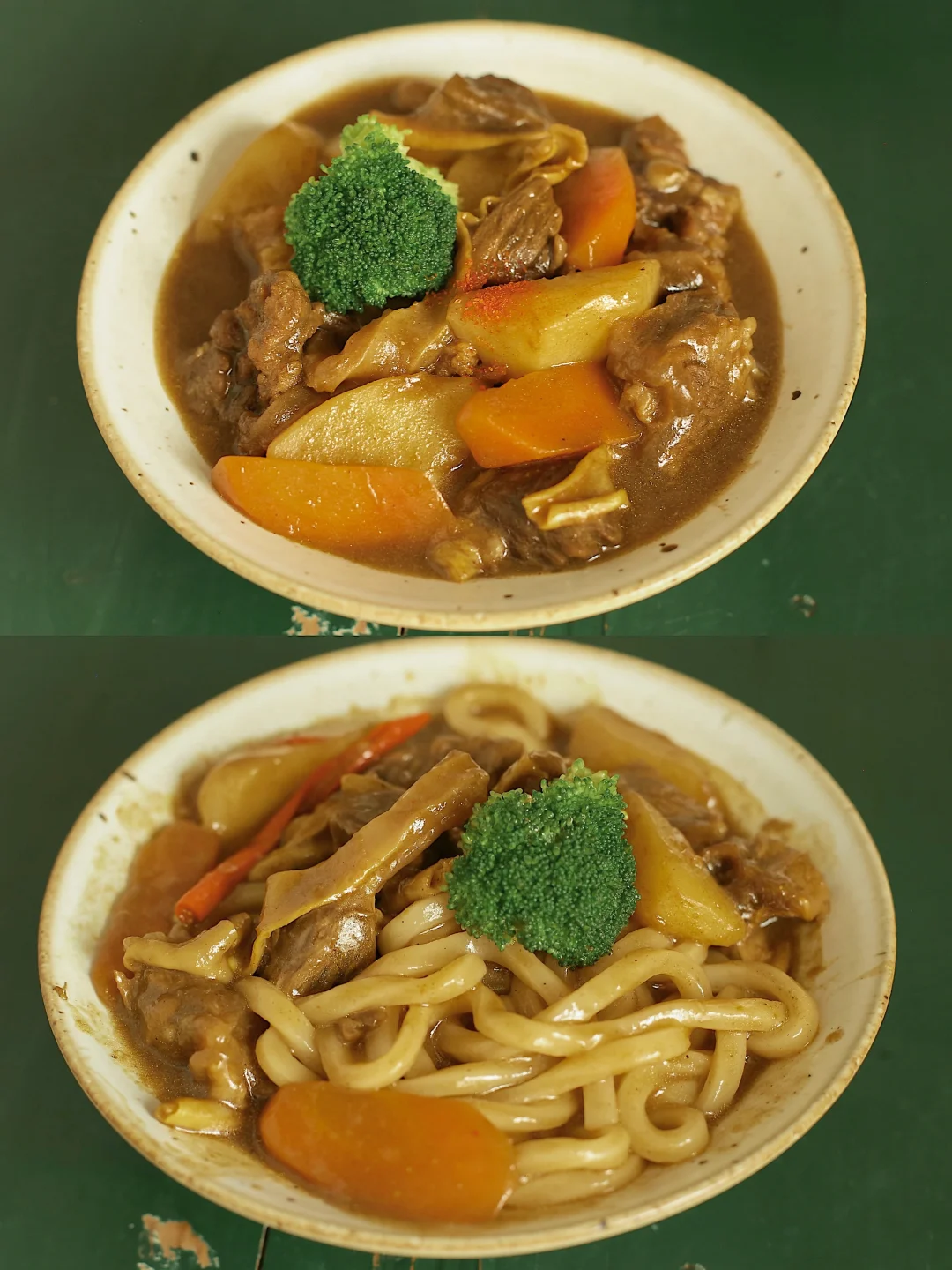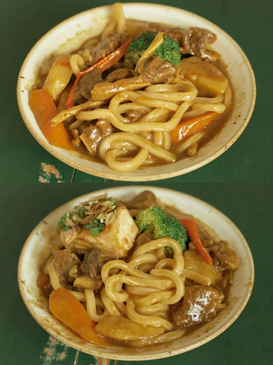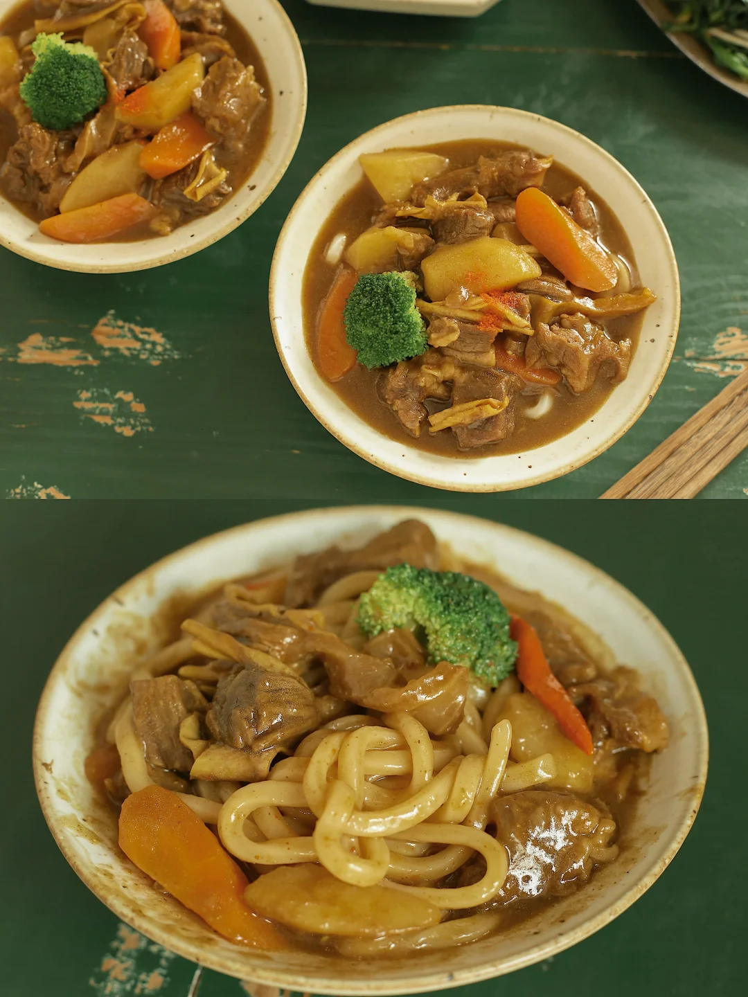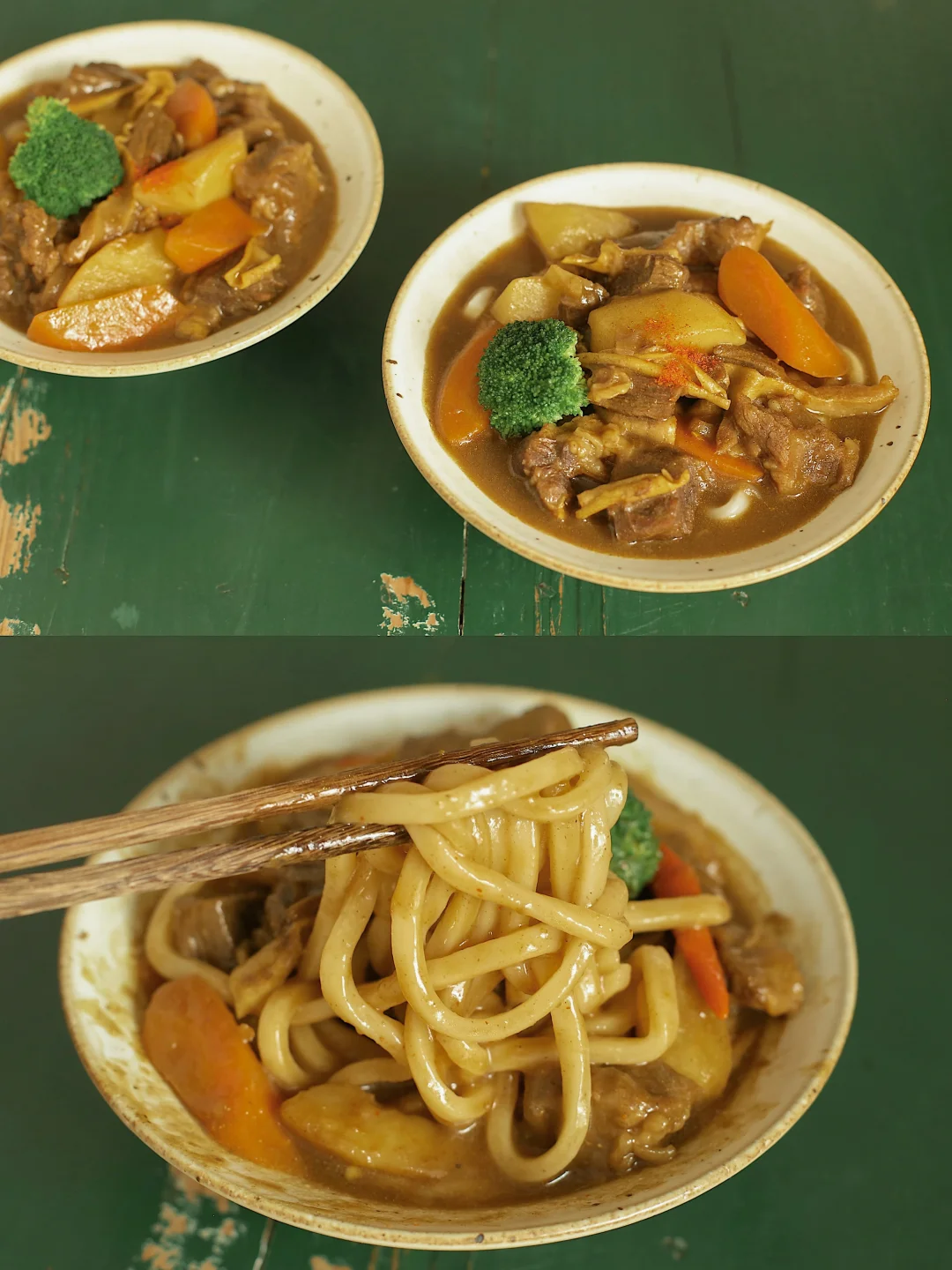 酱汁浓厚的辣咖喱牛肉捞乌冬面。