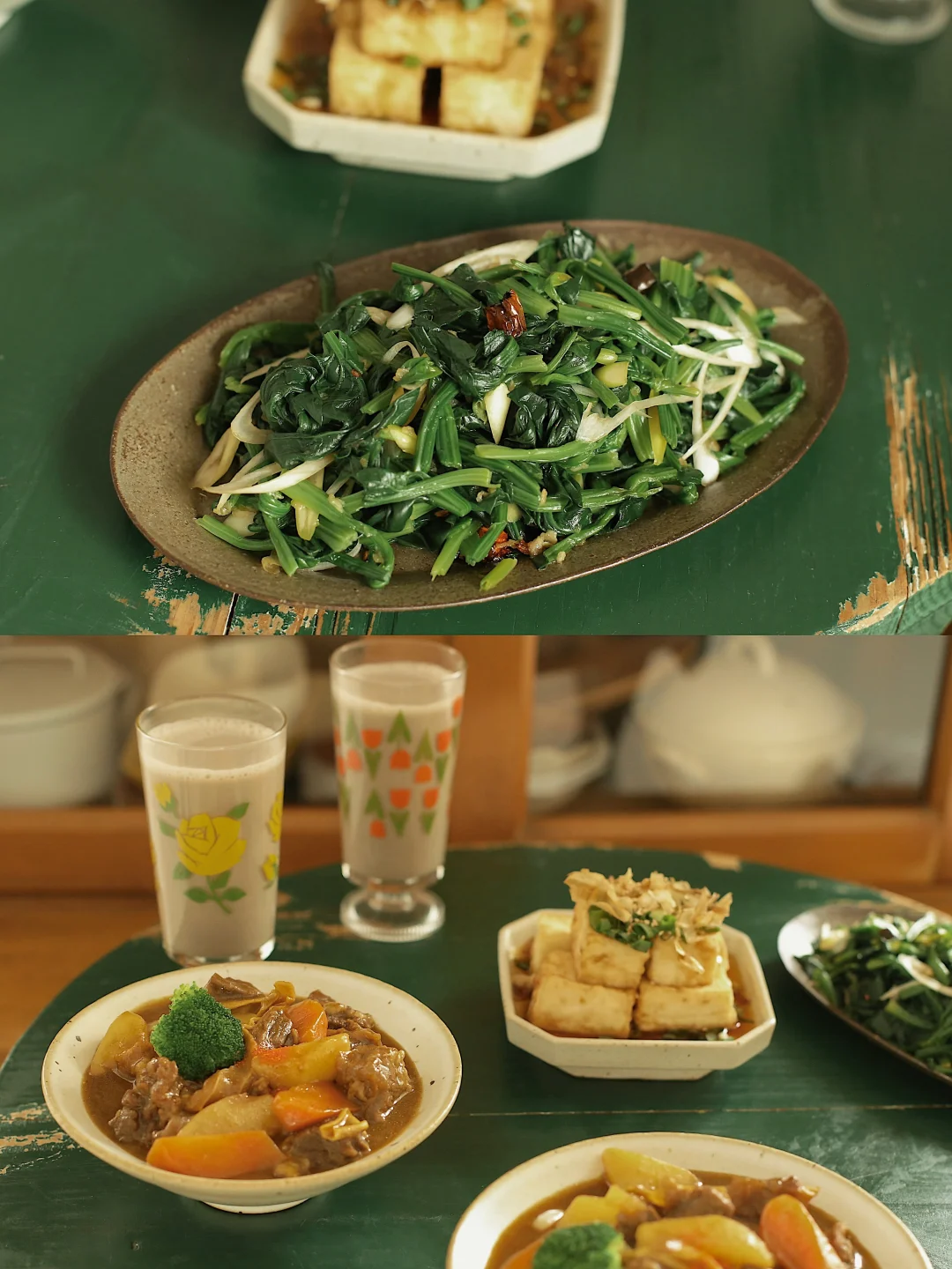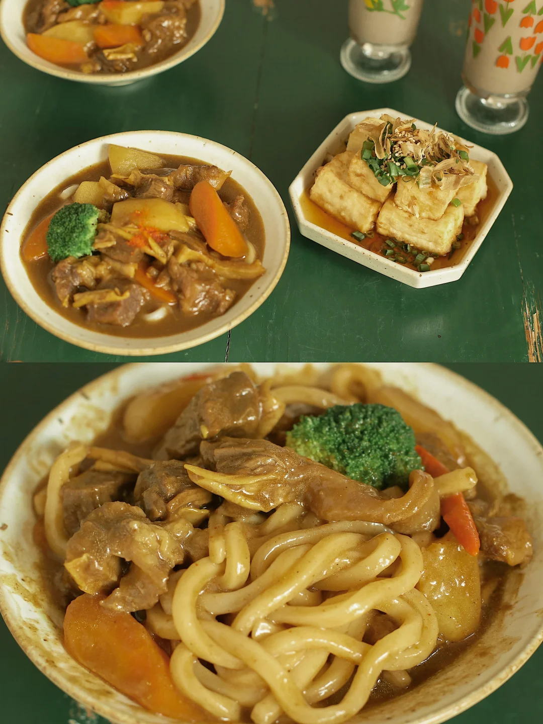 咖喱酱汁浓郁厚重~ 乌冬面劲道弹牙! 一定要用冷冻乌冬面 会好吃很多! 每一根乌冬面都裹着超浓郁的咖喱酱汁~ 太香啦! 还做了炸豆腐配面吃~ 喝的核桃芝麻豆浆 小菜是凉拌菠菜 这个季节的菠菜甜丝丝的