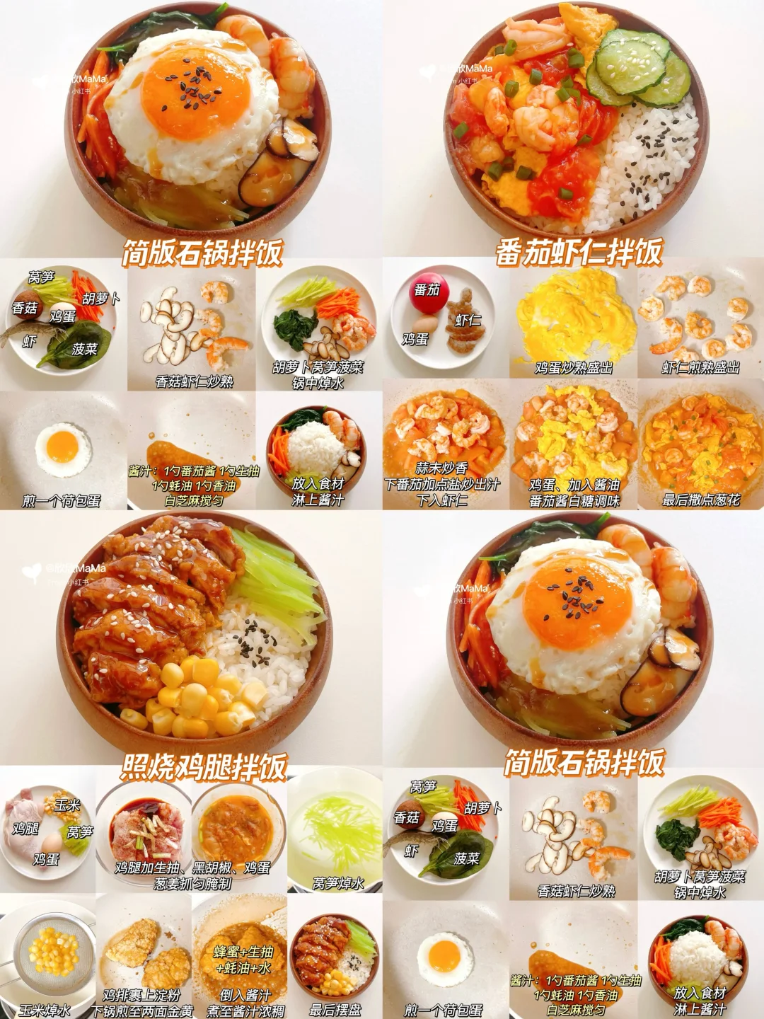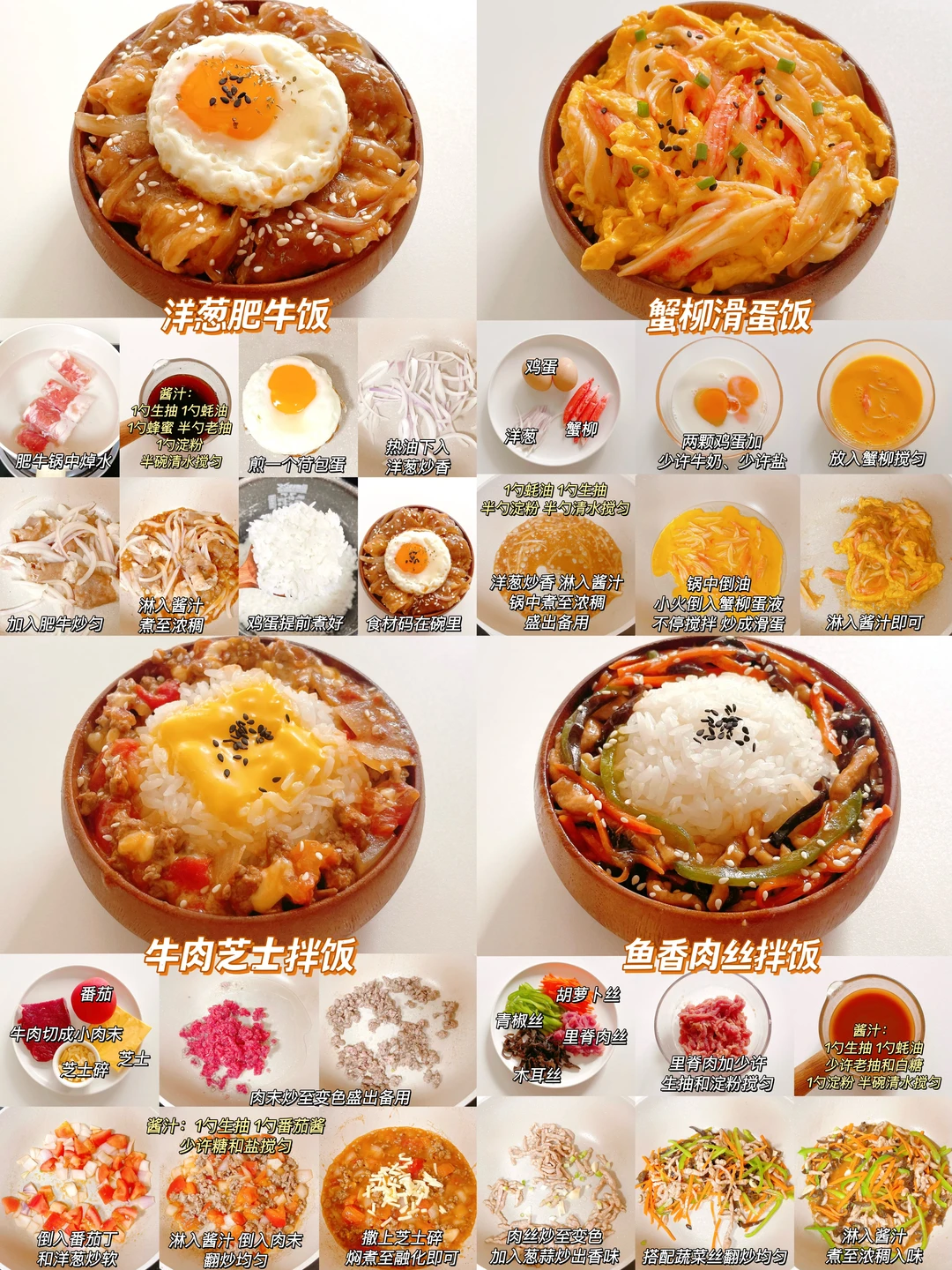 杭州的天气突然降温了,又来安排我们家都爱吃的拌饭了!酸甜开胃,有菜有肉,分分钟光盘没压力! 10分钟就能搞定的食谱!营养均衡,口感丰富!大朋友和小朋友都爱吃! ✅台式卤肉饭 ✅洋葱肥牛饭 ✅咖喱猪排饭 ✅番茄肉酱饭 ✅简版石锅拌饭 ✅鱼香肉拌饭 ✅牛肉芝士拌饭 ✅蟹柳滑蛋饭 ✅番茄鸡蛋拌饭 ✅口蘑鸡肉拌饭 ✅番茄虾仁拌饭 ✅照烧鸡腿拌饭 ⭐️具体做发请看图 拌饭拌饭的神仙吃法米饭的神仙吃法热气腾腾的三餐