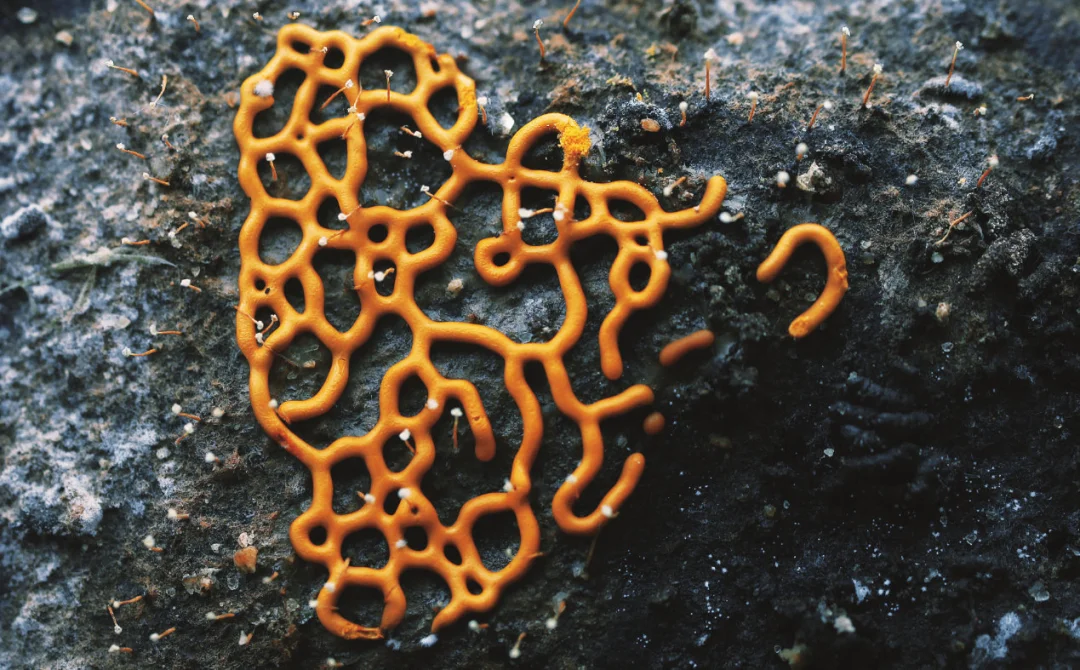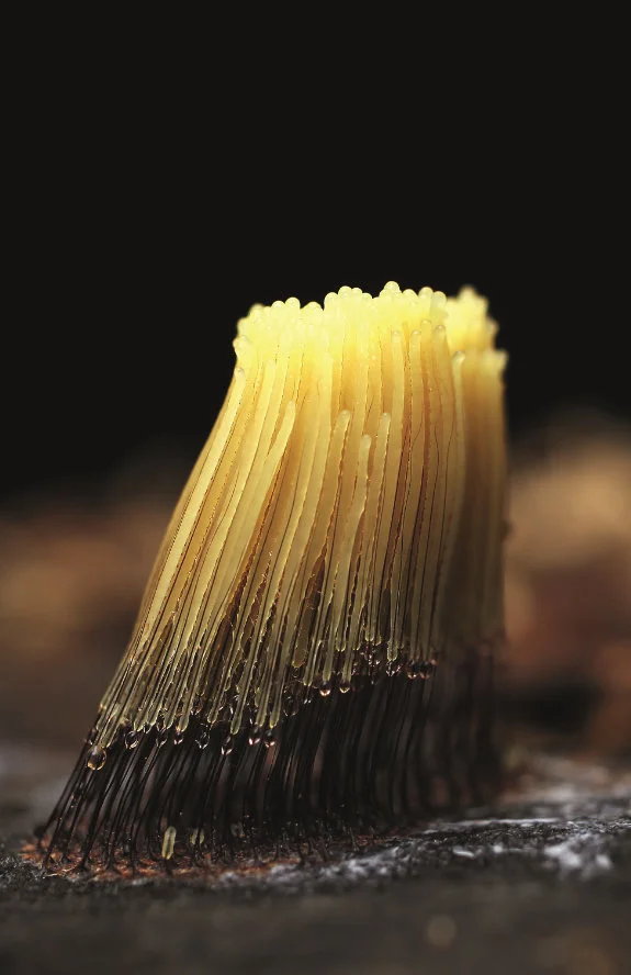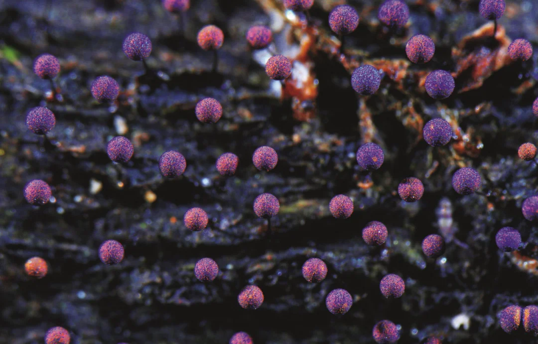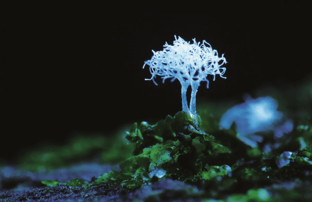 黏菌还有其他更有趣的名字——变形菌、菌虫,难道它是一种会变形的又是菌又是虫的生物吗?在黏菌一生中的大部分时间里,它像一团黏糊糊的鼻涕一样让人提不起兴趣,而当它形成子实体后,犹如丑小鸭华丽变身成白天鹅。子实体是一个生物学名词,主要用来指代大型真菌长出地面的部分。我们吃蘑菇时,吃的就是它的子实体部分,除此之外,蘑菇还有深藏在地下的菌丝。或许英文更能清晰地表达子实体的意思——“fruit body”,顾名思义,长满果实的身体就是子实体。这时黏菌幻化出绚丽的色彩、旖旎的身姿和多变的造型,有的像白色珊瑚,有的像棒棒糖,而更多种类的黏菌长得太过特别,而找不到可以类比的物种。在黏菌造型各异的身体里确实有它们的“果实”——孢子。摄影/温仕良