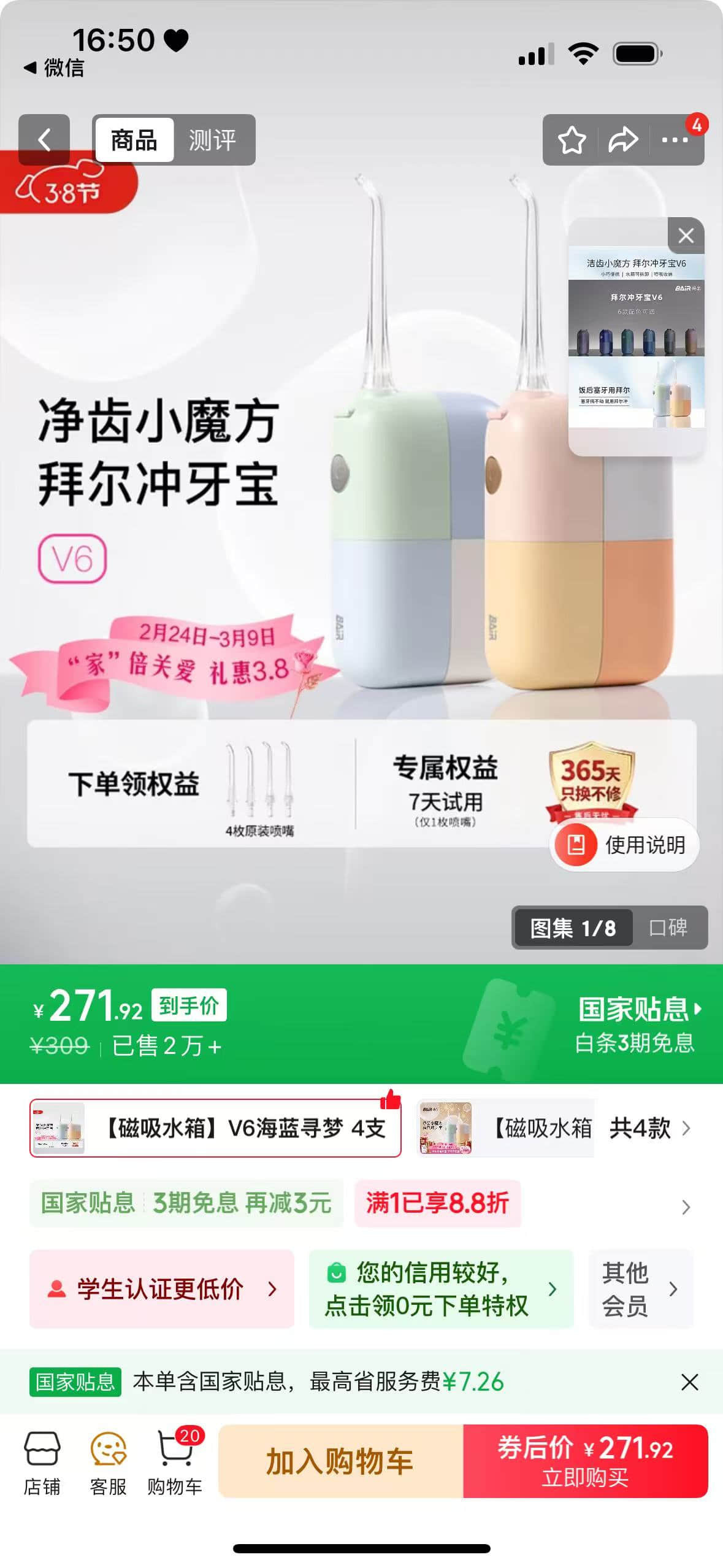 最近熬夜太多,牙龈总出血,赶紧入手了拜尔冲牙器,小魔方设计超便携,冲完牙齿清清爽爽。内服Swisse胶原水光瓶,外用海蓝之谜精萃水,急救修护,让皮肤喝饱水,做个水当当的春日美人,悦己才是终身浪漫!38送礼上京东,开运好礼、悦己好礼一应俱全!搜“38美美购”,送礼更有面。下单随单送鲜花,新品频道有独家周边,晚八夜市1元抢大牌,试用频道大牌美妆免费试,PLUS会员开运三件套别错过!【网页链接】跟刘宇宁来京东38节领五色花摩登兄弟