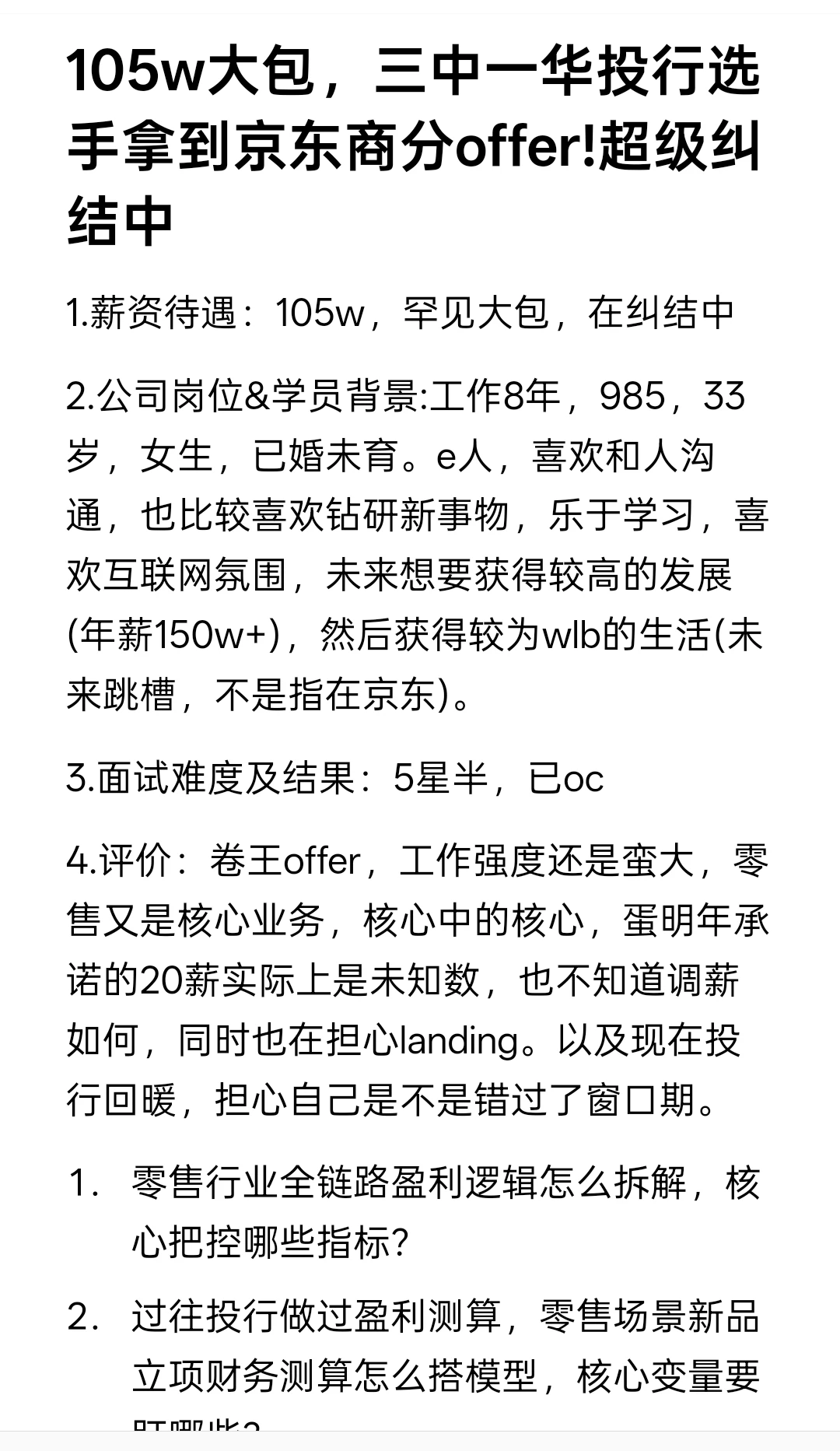 4.评价:卷王offer,工作强度还是蛮大,零售又是核心业务,核心中的核心,蛋明年承诺的20薪实际上是未知数,也不知道调薪如何,同时也在担心landing。以及现在投行回暖,担心自己是不是错过了窗口期。