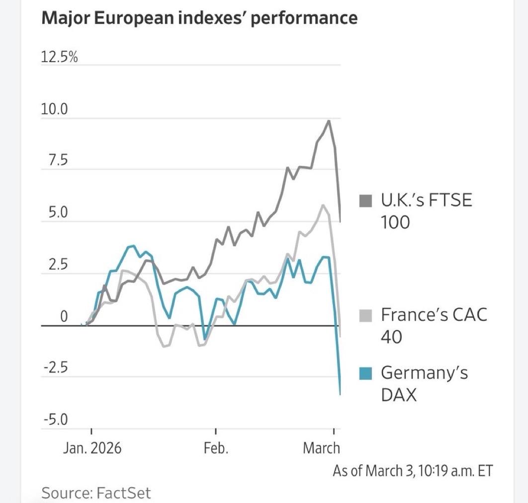 欧洲和亚洲股市下挫;与美国相比,这两个地区更容易受到中东能源供应中断的影响。