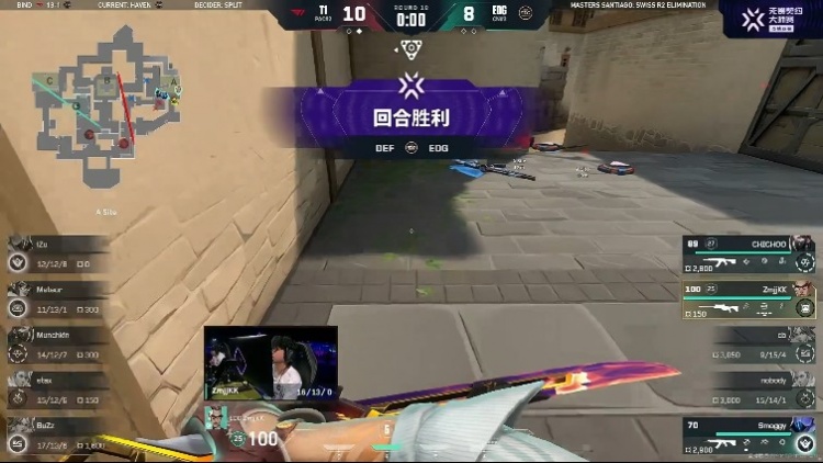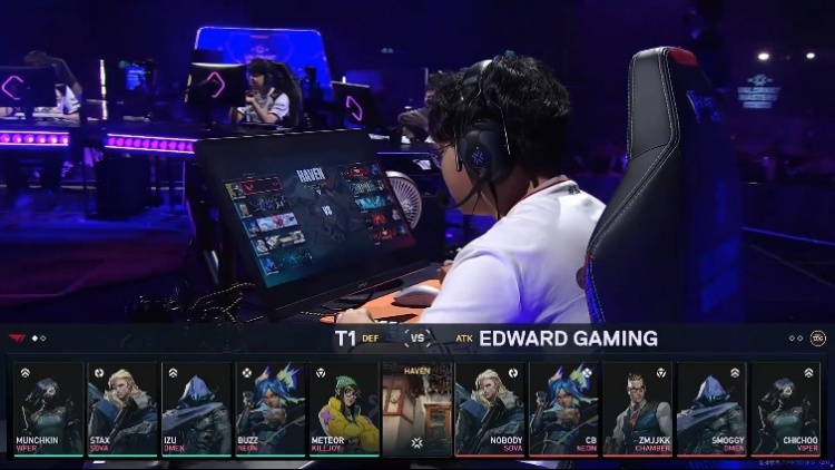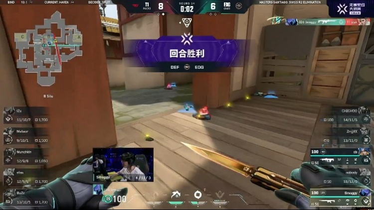 第十八局:T1一人开局单摸A大拿到信息后直接选择打A点,但是EDG及时回防在点内接住,EDG拿下一分!