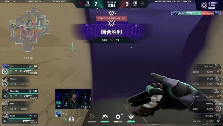 第十九局:开局双方在B点打出1换1,随后T1选择打B点,T1完成进点下包后直接双大守包,EDG回防被收下,T1拿下胜利!