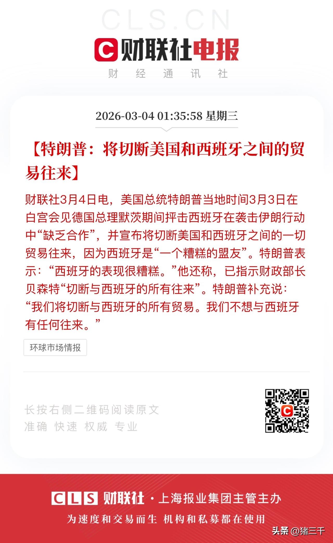 反对霸权态度坚定、给西班牙点赞! 西班牙态度坚定的拒绝了美国借用军事基地方便打击伊朗的请求。 白宫恼羞成怒, 扬言要切断和西班牙之间的贸易往来。 这些斗争都是明面上的, 大家都知道西班牙这些年目光向东看, 白宫“脱钩断链”、斩首伊朗和委内瑞拉、金融狙击印尼和巴基斯坦都是要拆解东大全球布局。 从去美国化的全球化到去美元的全球化, 世界人民反霸权主义的决心从未如此坚定。 美国就是要把这种苗头掐死在萌芽状态, 西班牙好样的, 全世界民主自由的人民都支持你。 …