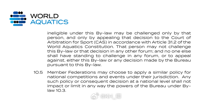 新章程规定,任何以支持、认可或参与等形式,涉足纵容使用违禁物质 / 方法赛事的个人,将失去在世界泳联任职,以及参加其举办的世锦赛、世界杯等所有赛事和活动的资格,适用人群涵盖运动员、教练、队官、管理人员、医疗人员、政府代表等所有相关角色。