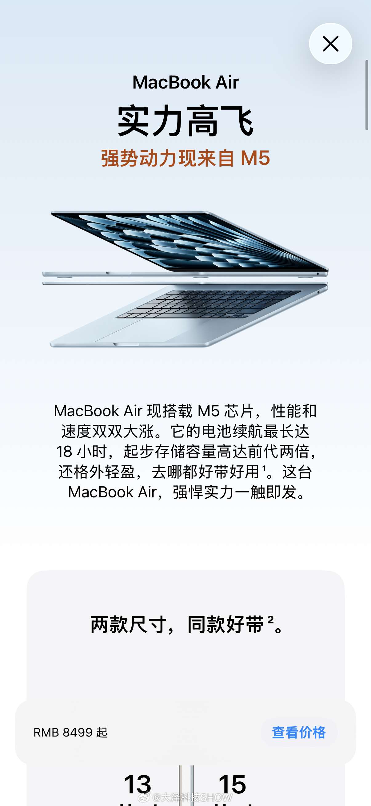 MacBook Air搭载M5芯片,13/15英寸双尺寸,16GB+512GB起步,支持Wi‑Fi 7与蓝牙6,续航长达24小时,13英寸8499元、15英寸9999元,加量不加价,轻薄便携、性能够用,学生党与办公党闭眼入。