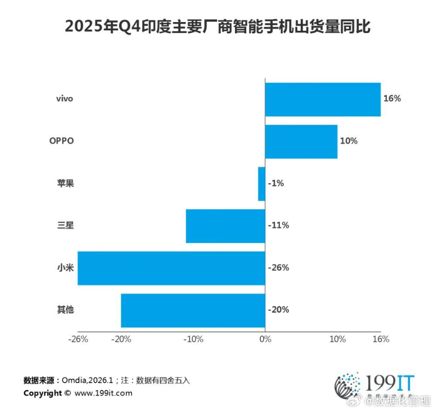 2025年Q4印度主要厂商智能手机出货量同比、以及厂商市场份额。