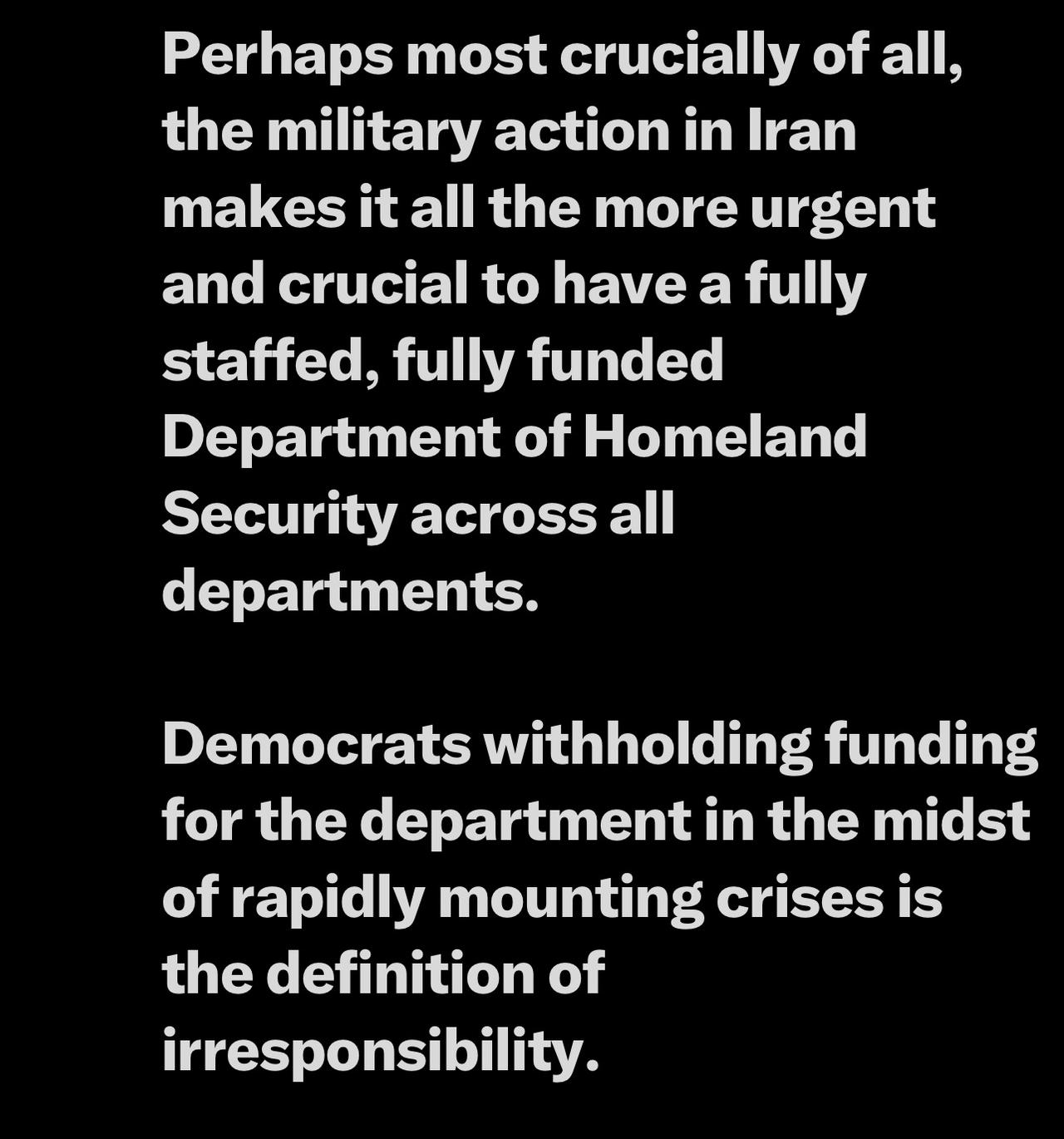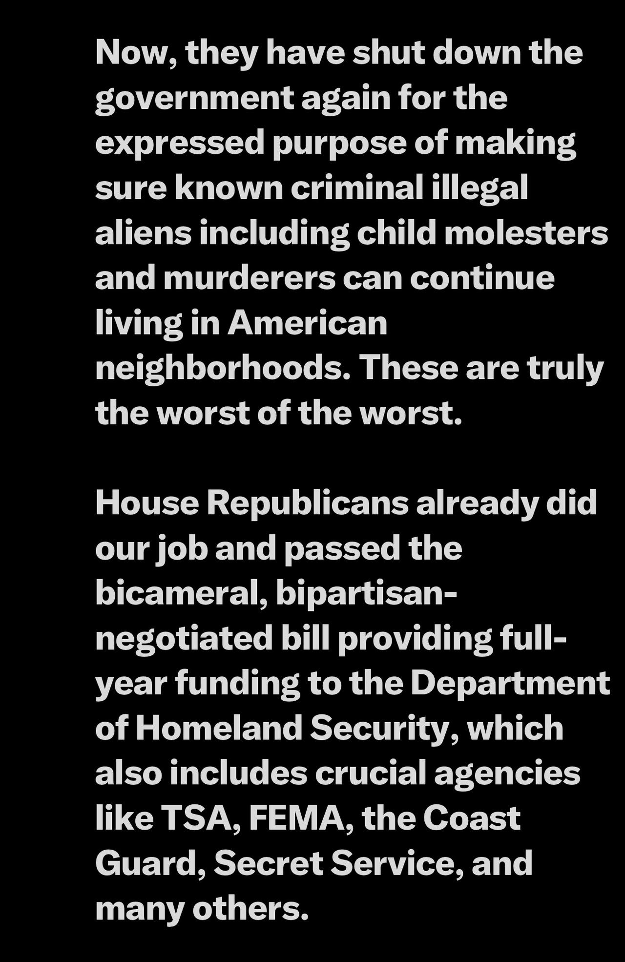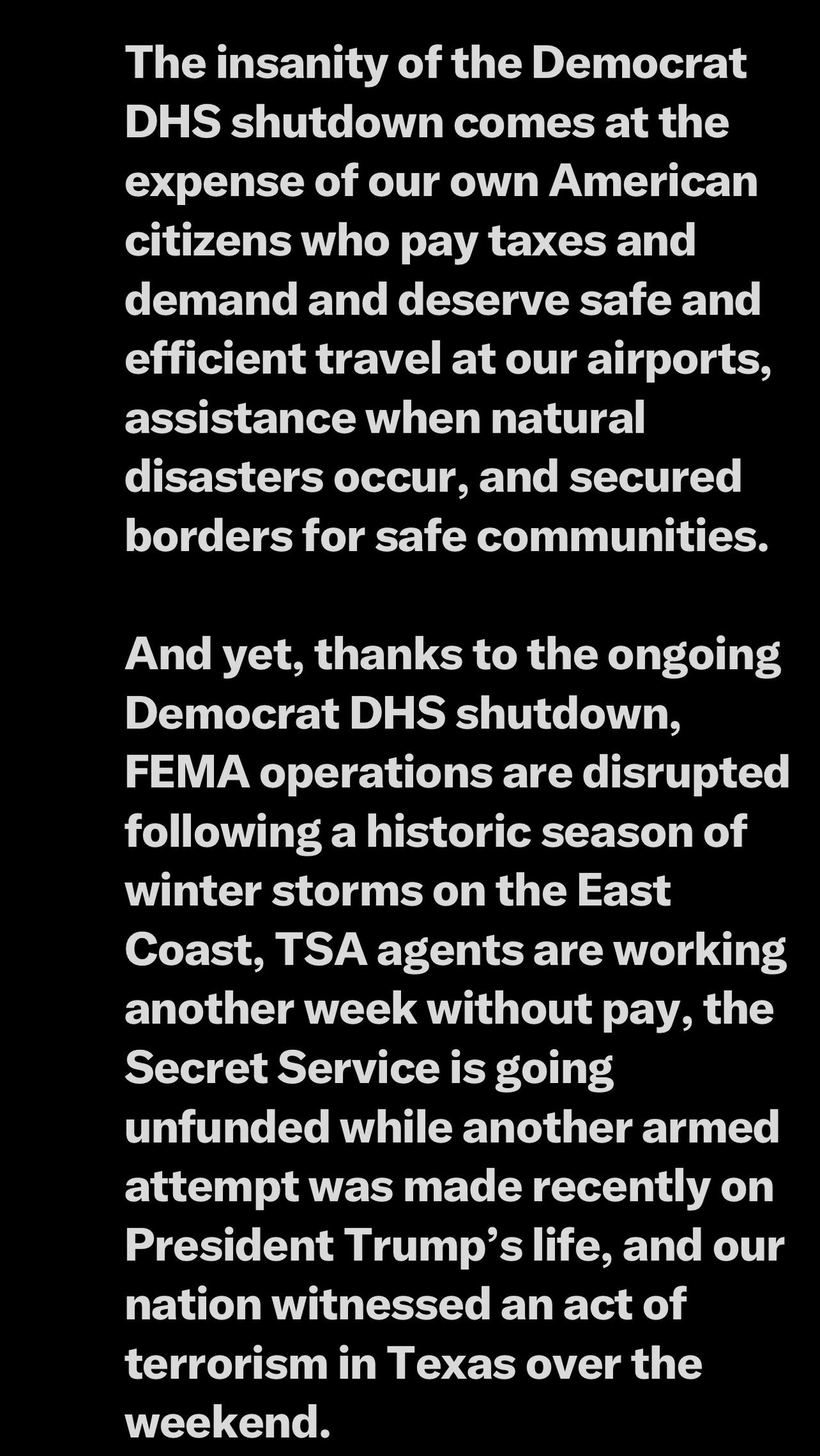 民主党人关闭国土安全部的疯狂行径,是以我们纳税的美国公民的利益为代价的,他们要求并理应在我们的机场享受安全高效的旅行,在自然灾害发生时获得援助,以及为社区安全而确保的边境安全。