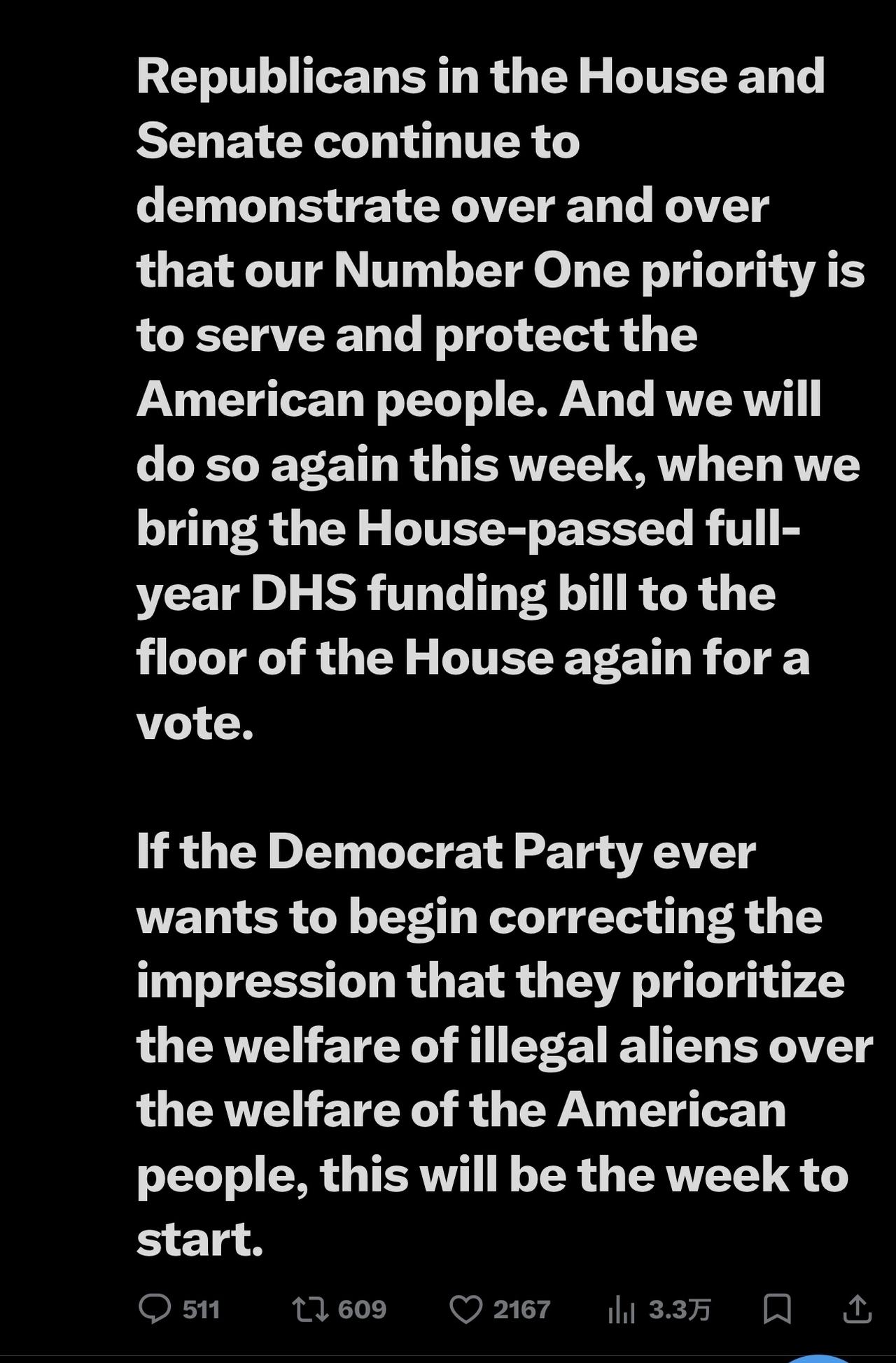 众议院和参议院的共和党人一再表明,我们首要的任务是服务和保护美国人民。本周,我们将再次这样做,把众议院通过的国土安全部全年拨款法案再次提交众议院进行投票表决。