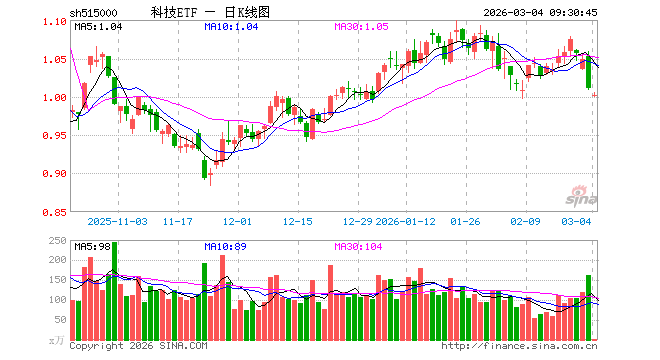 3月4日,科技ETF(515000)开盘跌1.09%,报1.000元。科技ETF(515000)重仓股方面,中际旭创开盘跌1.73%,新易盛跌1.20%,恒瑞医药跌0.73%,中芯国际跌0.91%,药明康德跌0.48%,海光信息跌1.67%,北方华创跌0.66%,胜宏科技跌1.37%,京东方A跌0.69%,兆易创新涨0.00%。