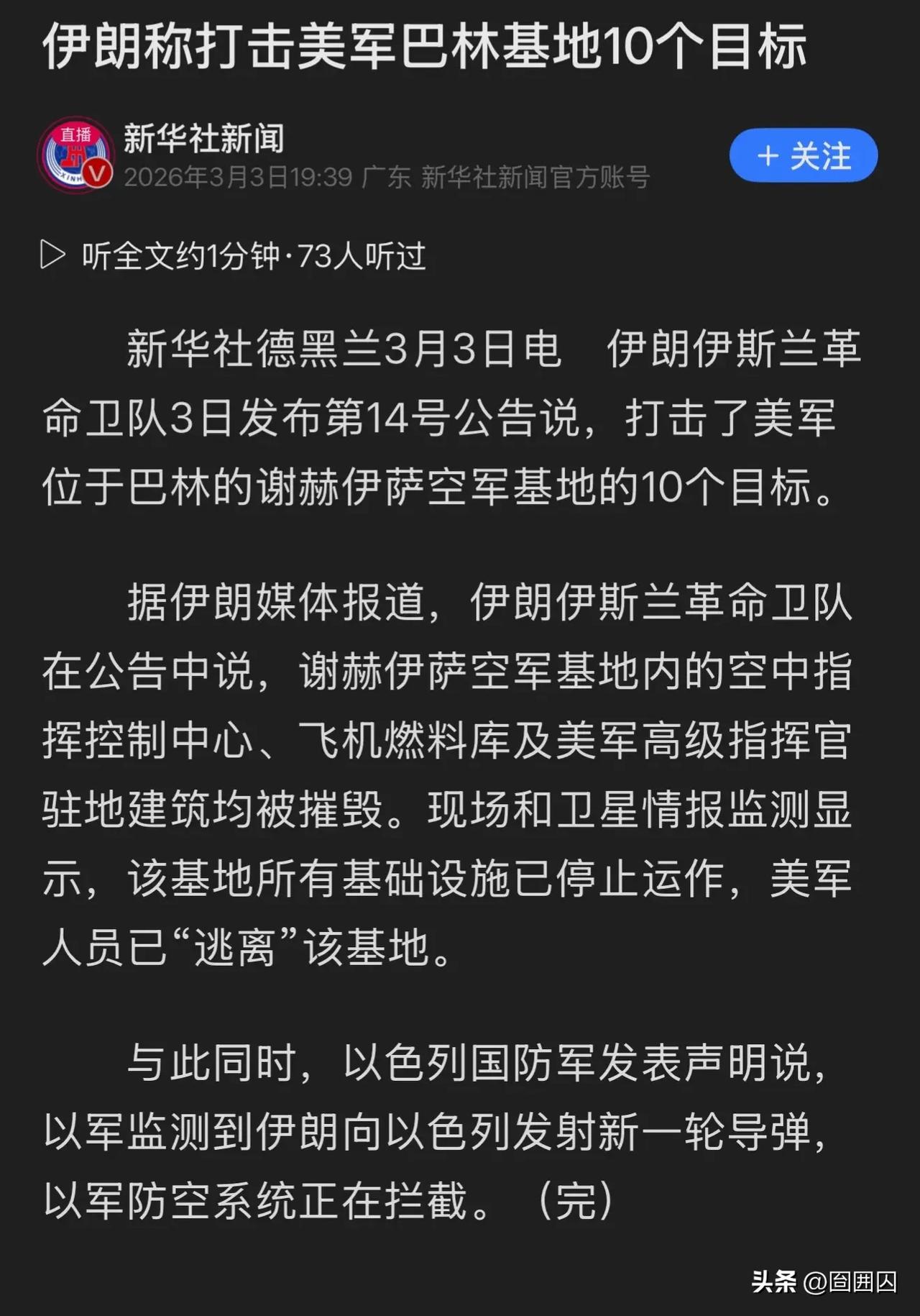 继巴林的萨勒曼港,美国第五舰队指挥,预警、后勤中心被打坏后,伊拉克埃尔比勒美军基地的弹药库被自杀式无人机砸中后,二次爆炸烧了好几个小时,库存装备和燃料全毁了。 更大的战果是3月3日夜晚,伊朗伊斯兰革命卫队通过大规模无人机和导弹袭击,重创了巴林谢赫艾萨地区的美国空军基地。从现场视频看,美军几乎没有任何防空反击,20架无人机和3枚弹道导弹精准连续打击了整个基地。弹药库爆炸的连锁反应太吓人,易燃易爆品连环炸,比初次打击破坏力大得多。(卫星图片等今日更新,最后一张图是位于杭州的民间卫星公司前两日拍摄,并非昨晚战果。) 这波反击算是报复行动的关键一击,专门针对美以此前的越境打击发起反制,不搞无差别攻击,只打军事目标,既守住道义底线,又狠狠戳中美军痛处。现场的巴林🇧🇭群众欢呼雀跃,举手相庆。 巴林第五舰队司令部、卡塔尔乌代德基地同步遇袭,指挥、通信、油料节点连续被毁,美军中东部署体系被拆得七零八落,前沿作战能力直接腰斩而不止。 当然,美方刻意压低伤亡与损失数据,只承认设施受损,却不敢公开弹药库存损失清单,怕引发国内舆论哗然,更怕动摇中东盟友的信心。 霸权霸凌从来都有反噬,美军长期在中东耀武扬威,把他国领土当作战场,如今尝到被精准反制的滋味,完全是咎由自取。 伊朗用实战证明,小国照样能靠自主军工与战术创新,打破大国军事神话,不惹事也绝不怕事,主权尊严从来都是打出来的。