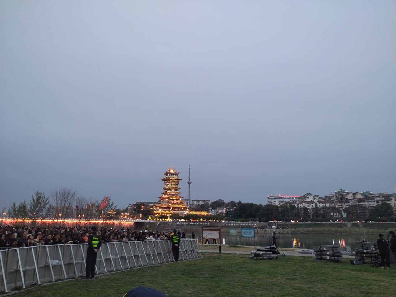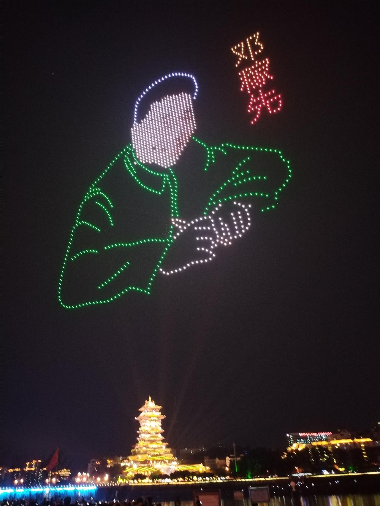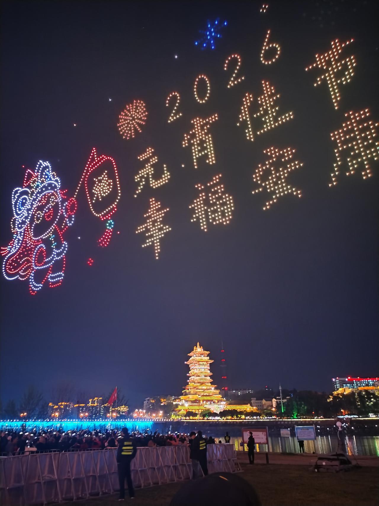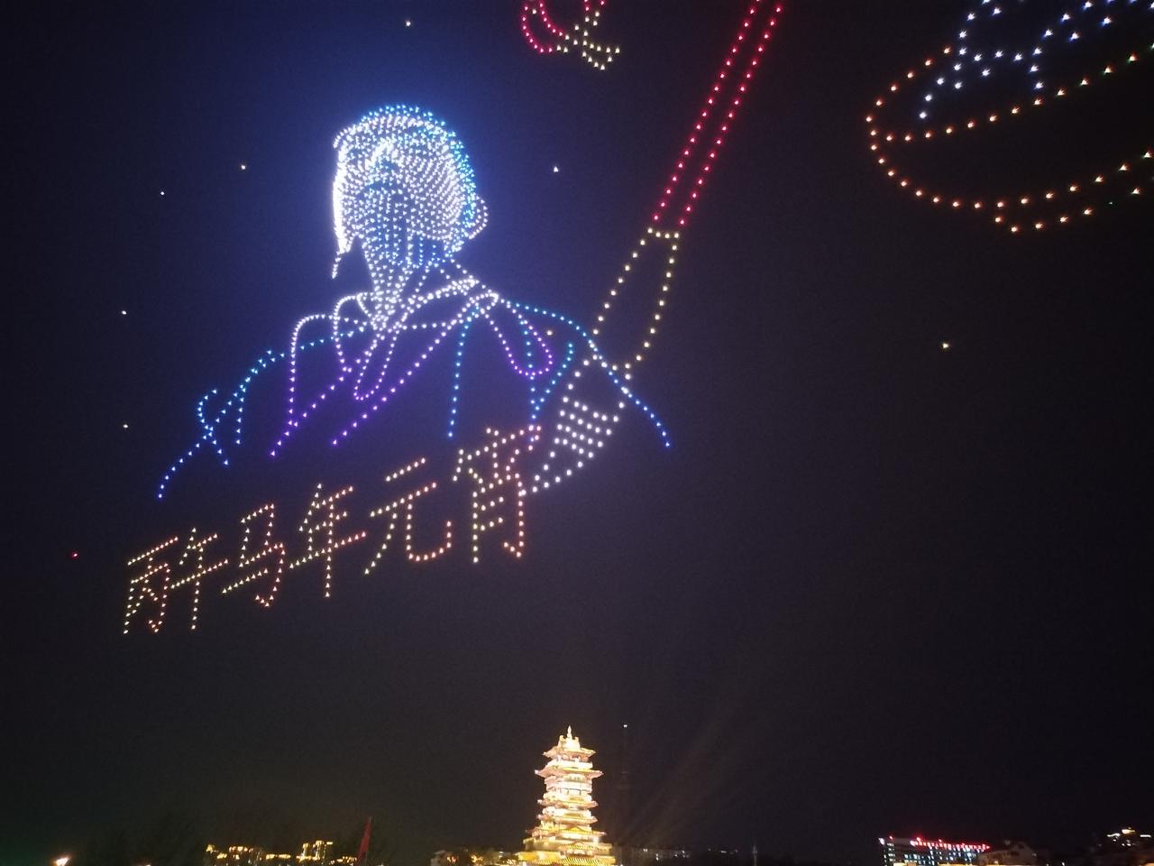 正月十五月亮圆,人团圆,好事连连。 由绵阳文旅投资集团举办的”绵州夜空元宵光影秀”大型无人机表演活动,三天来,今晚正月十五是最后一天。 今晚夜幕降临前,绵阳市滨河广场,铁牛广场,人们从四面八方早早就聚集在广场上,期待着最壮观的无人机表演秀。 夜幕降临,无人机群伴随着巨大轰鸣声腾空而起,在夜空中闪烁,似群星,似烟火璀璨,时儿有序组成美丽壮观的图案,精妙绝伦。 李白故居上空,不时呈现出,为我国国防做出巨大贡献的科学家,邓稼先,于敏等科技图案; 丙午马年元宵,元宵节幸福安康,一幅幅精彩的图案,与灯光璀璨的翘王楼相互衬托,在三江之水的咉照下,令人们感动欢呼。 正月十五月亮圆,团团圆圆,圆圆满满。