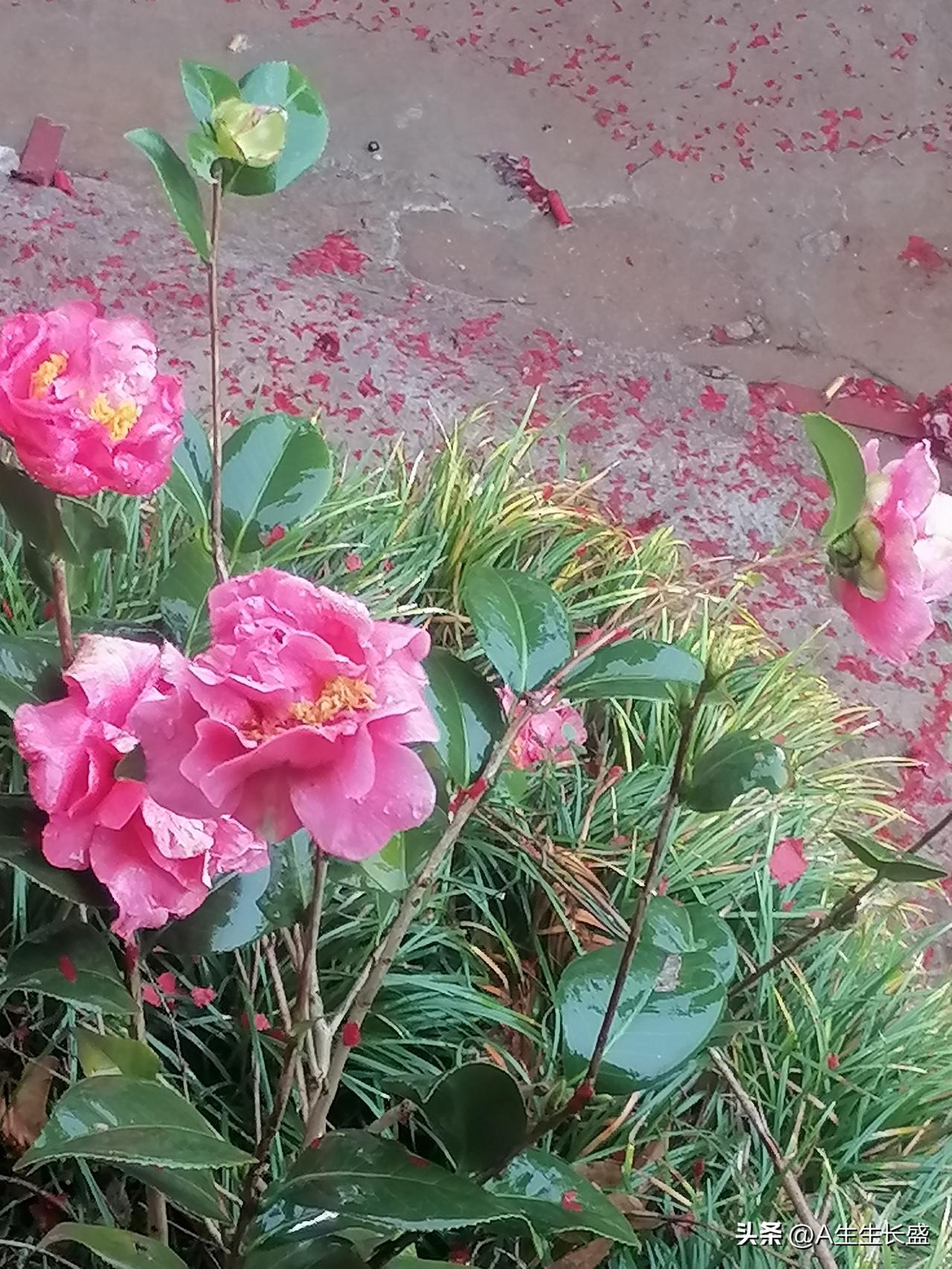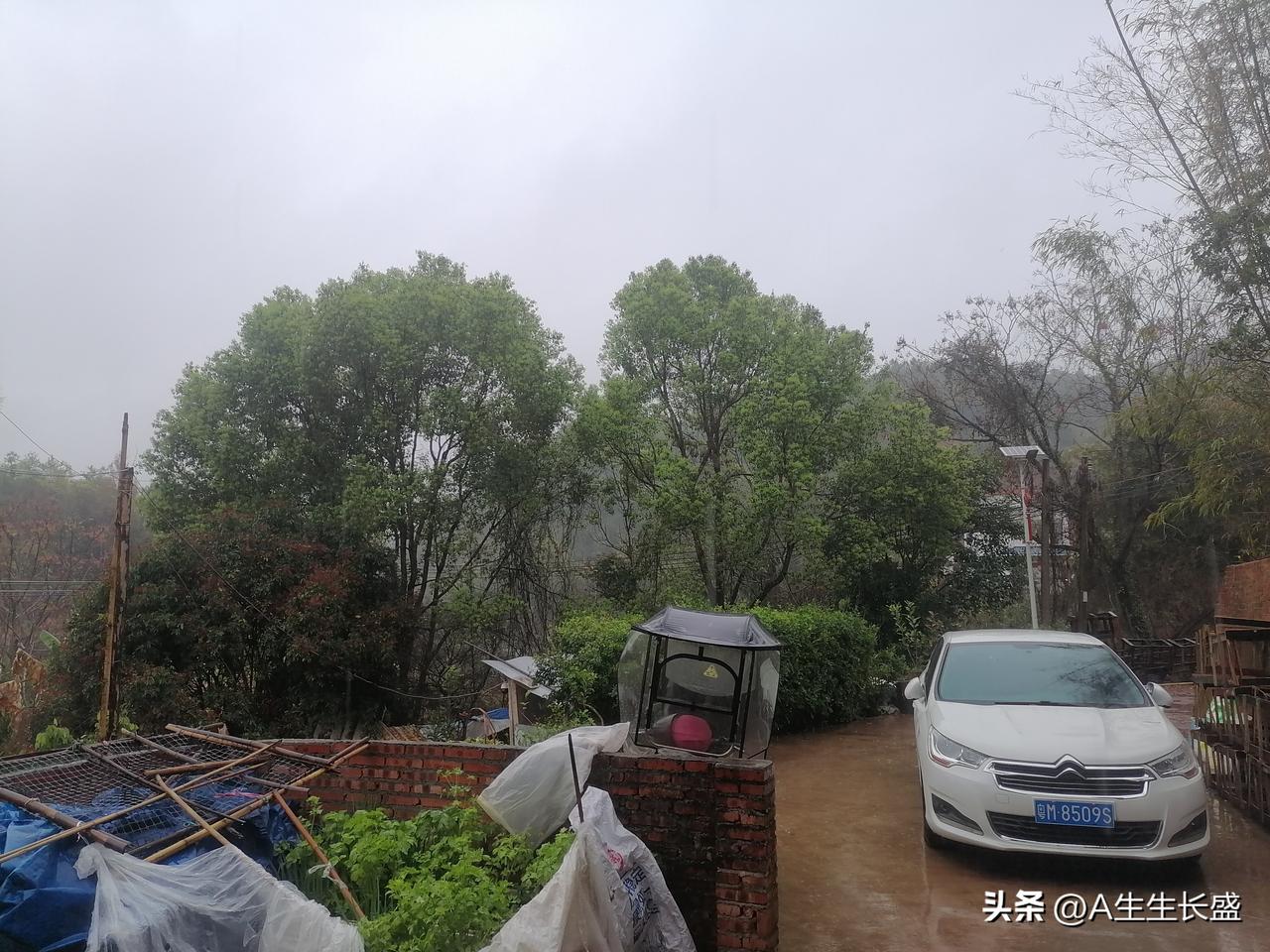 漂亮的花花草草,雾蒙蒙的天空下着小雨,茂盛的树木下小车摩托车静静的停放着,住在山