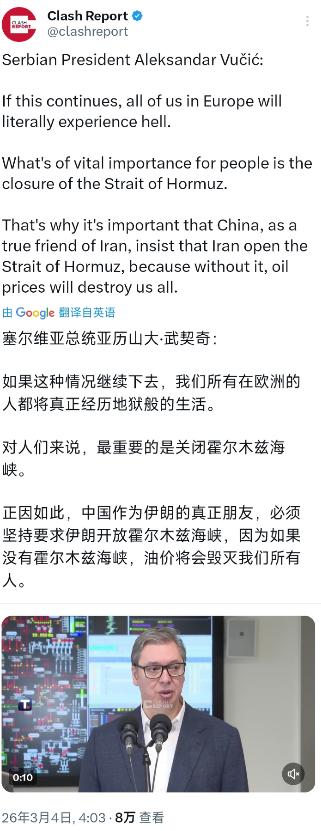 作为中国的朋友,塞尔维亚总统武契奇对中国的施压并不合适。武契奇今天(北京时间3月4日)接受采访时表示:“如果这种情况继续下去,我们所有在欧洲的人都将真正经历地狱般的生活。对人们来说,最重要的是关闭霍尔木兹海峡。正因如此,中国作为伊朗的真正朋友,必须坚持要求伊朗开放霍尔木兹海峡,因为如果没有霍尔木兹海峡,油价将会毁灭我们所有人。” 当前的海峡僵局,根源是美以对伊朗的大规模军事打击。哈梅内伊遇袭身亡,多名军政高层殉难,伊朗已经被逼到了背水一战的绝境。 关闭霍尔木兹海峡对伊朗来说,是伤敌一千自损八百的无奈之举,这不是单纯的能源牌,而是关乎国家存续的战略反击。作为主权国家,伊朗的决策基于自身安全考量,任何外部力量都无权指手画脚,中国自然也不例外。 中国与伊朗的关系是真正的战略伙伴,但这种伙伴关系的核心是相互尊重,而非一方对另一方发号施令。 中国从来不会要求朋友做损害自身利益的事,更不会干涉他国内政。伊朗关闭海峡是为了抵御外部侵略,保护国家和人民安全,在这种生死关头,让中国去“坚持要求”伊朗开放海峡,无异于让中国逼迫朋友放弃自保,这既违背外交伦理,也完全不符合中国一贯的处事原则。 再看塞尔维亚的能源困境,其本质是自身地缘格局和能源结构造成的,不能简单归咎于霍尔木兹海峡的局势。塞尔维亚是内陆国家,没有出海口,能源运输完全依赖邻国管道,这本身就存在天然短板。 其国内唯一的大型炼油厂被俄罗斯控股,还遭到美国制裁,导致原油供应中断、国际支付冻结,即便霍尔木兹海峡畅通,其能源供应也面临结构性难题。 近年来塞尔维亚虽在推进能源多元化,开通了多条跨境管道,提升了战略储备,但这些措施尚未完全落地,面对全球能源震荡自然难以招架。 武契奇担忧油价上涨毁灭欧洲,这种焦虑可以理解,但把解决问题的钥匙交到中国手里,显然找错了方向。 霍尔木兹海峡承载着全球近三成的海运石油贸易,一旦长期关闭,国际油价突破每桶100美元并非危言耸听,欧洲作为能源进口大户,确实会面临严峻冲击。但这一危机的始作俑者是美以的军事行动,而非中国或伊朗。 欧洲能源问题的根源,还在于其自身能源转型的脆弱性,俄乌冲突后过度依赖液化天然气现货市场,缺乏稳定的供应渠道和足够的储备缓冲,才会在海峡局势变动时陷入被动。 中国作为全球最大的原油进口国,同样深受霍尔木兹海峡局势的影响。海峡运输受阻会直接推高中国的进口成本,影响国内能源稳定,中国比任何国家都希望航道保持畅通。但解决问题的正确方式是劝和促谈,推动各方停火止战,而不是施压某一方。 中国外交部已经明确表态,敦促各方停止军事行动,维护海峡安全,这才是化解危机的根本路径。施压伊朗开放海峡,不仅无法解决问题,反而会激化矛盾,让局势更加失控。 更重要的是,中塞关系一直基于相互理解和支持,是名副其实的“铁杆朋友”。中国在塞尔维亚面临困境时,始终尽力提供帮助,从匈塞铁路的建设到经济领域的合作,都为塞尔维亚的发展提供了实实在在的支持。 朋友之间应该相互体谅,而不是单方面提出超出能力范围的要求。武契奇的表态,忽视了中国的外交立场和实际困难,也无视了危机的真正根源,这种施压不仅难以达到目的,反而可能影响两国间的互信。 事实上,要解决欧洲的能源危机,关键在于停止中东的战火,恢复霍尔木兹海峡的正常通航环境。各方应回到谈判桌前,通过外交途径化解分歧,而不是把责任推给第三方。 塞尔维亚若想真正摆脱能源困境,更需要加快自身的能源结构调整,完善多元化供应体系,强化区域能源合作,而不是寄希望于中国向伊朗施压这种不切实际的方式。 在复杂的国际局势中,朋友之间的支持应该是相互的、理性的,而非单方面的施压与苛求,这才是国家间相处的长久之道。