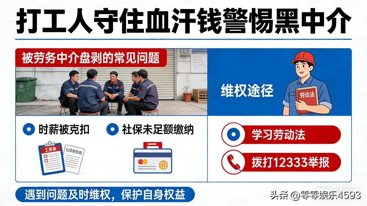 在广东打工的老乡们注意了!现在不少工厂招工都不靠直招,而是通过劳务中介。工人以为进的是大厂,实际签的却是和劳务公司的合同,这层 “中介皮” 背后,藏着对咱们权益的层层盘剥。 厂里说的 “时薪 25”,到中介手里可能变成 “20 + 管理费 + 工时差”,工人实际到手连 18 都难;说好的 “社保全额缴纳”,中介却按最低基数给你交,中间的差额都进了他们口袋。还有押身份证、乱收费、扣押金…… 这些都是常见操作。 咱们得知道,《劳动法》明确规定工资不能低于最低工资,社保必须按时足额缴纳,签合同要明确双方责任。可中介总钻空子,利用咱们对法律不熟悉,把本该工厂承担的成本转嫁到工人身上。 如果遭遇工资克扣、社保断缴,别慌!保留好考勤表、工资条,直接打 12333 找劳动监察队。维护自己权益,从看清合同、拒绝 “黑中介” 开始。