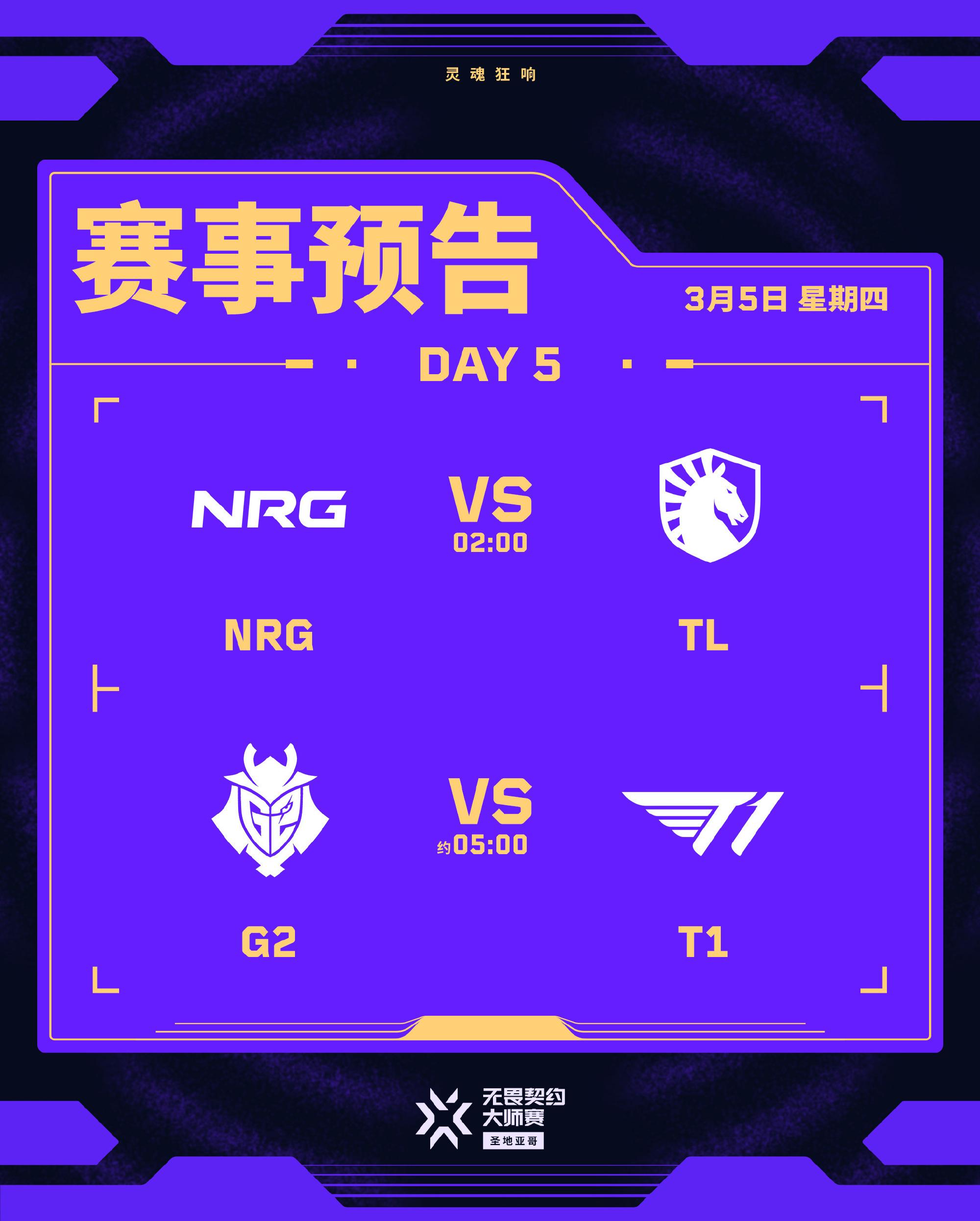 虎扑03月04日讯无畏契约圣地亚哥大师赛第五日赛事将于3月5日北京时间02:00开赛,详细赛事预告如下: