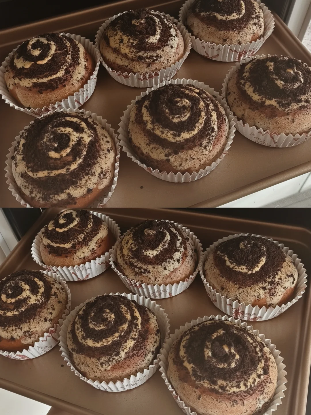 [三R]取面团按扁,包入巧克力币,表面喷水,沾奥利奥,放入面包纸托,烤箱35度50分钟发酵1.5倍大(烤箱里面放一碗热水)。