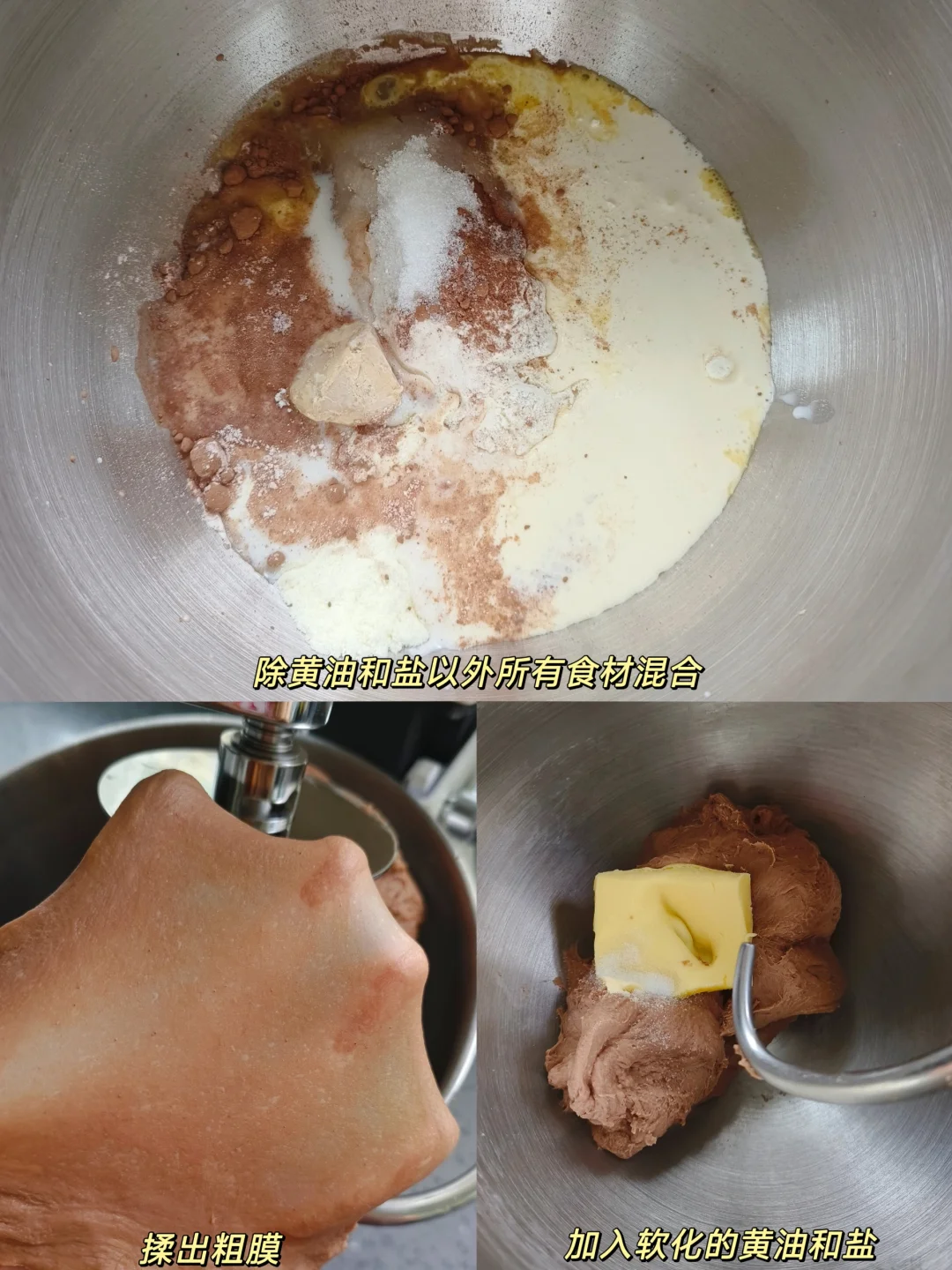 [一R]除黄油和盐以外所有材料混合厨师机揉出粗膜,加入软化黄油和盐继续揉出细膜。