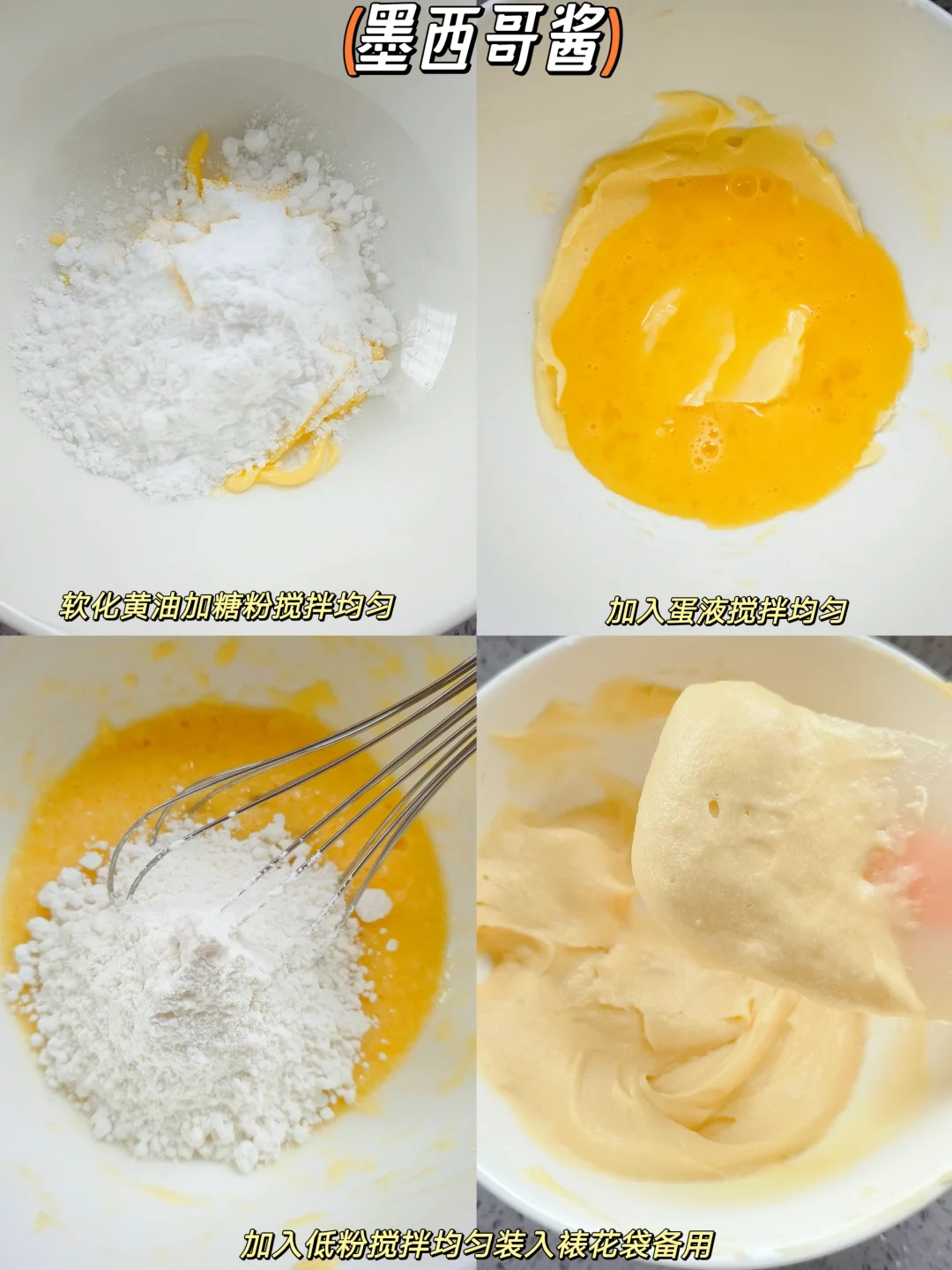 [三R]墨西哥酱:软化黄油加糖粉搅拌均匀,加入蛋液搅拌均匀,加入低粉搅拌均匀,装入裱花袋备用。