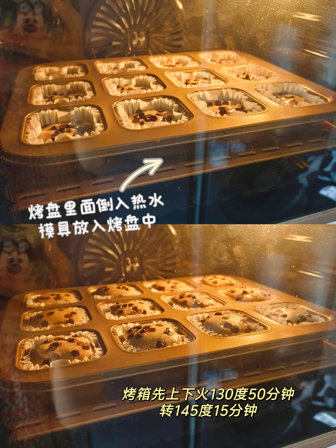 [三R]烤盘里面加入热水,模具放入烤盘中,烤箱先130度烤50分钟,转145度15分钟,出炉喽