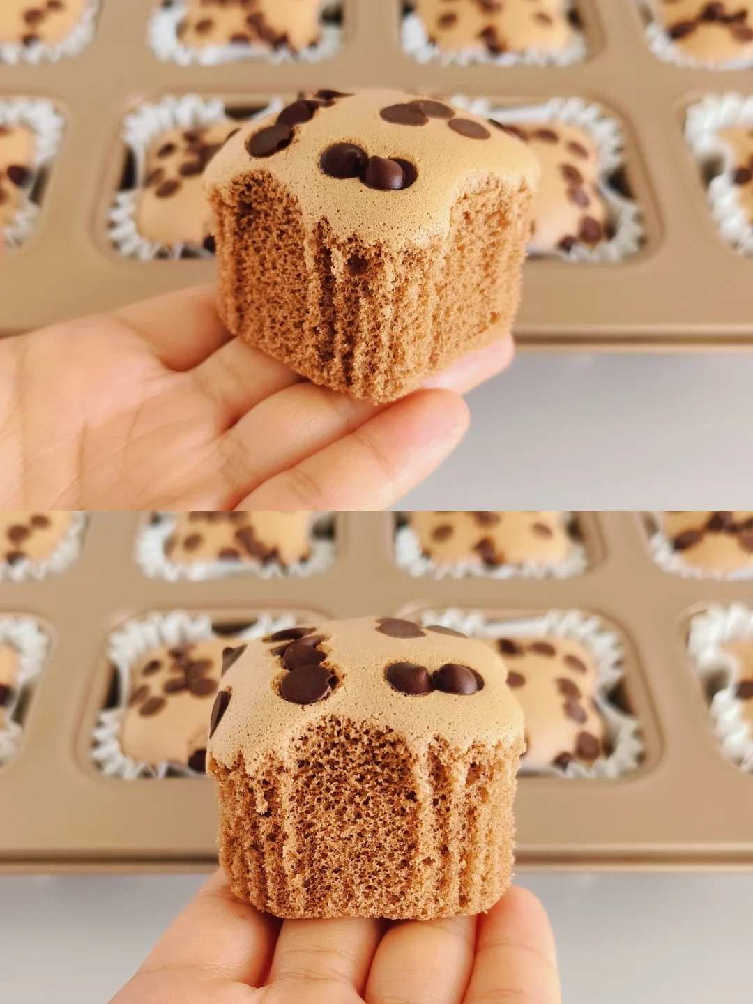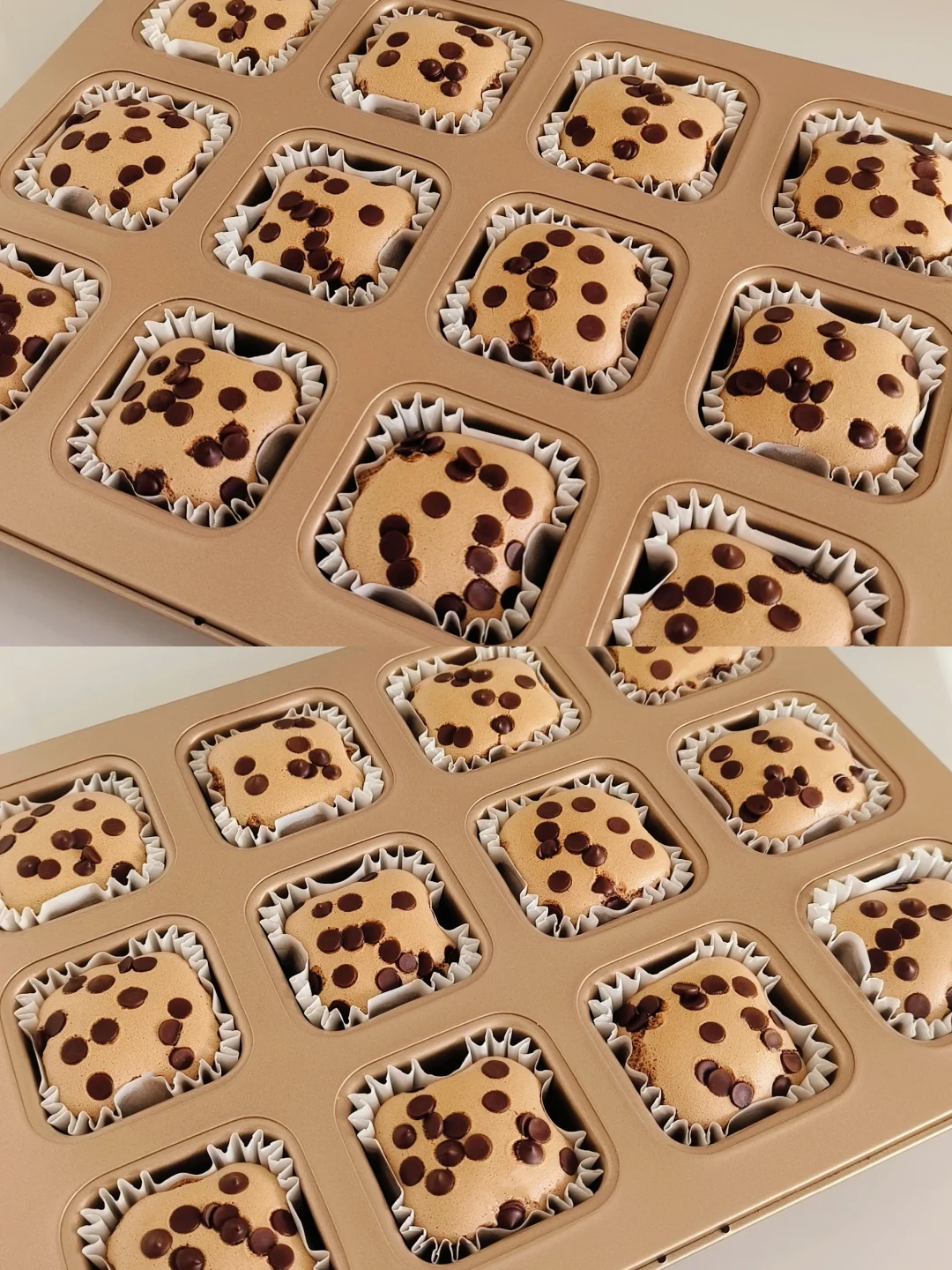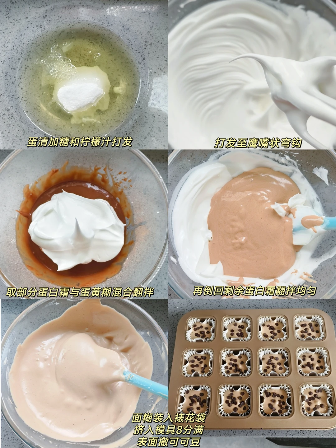 [二R]烤箱预热。蛋清加糖和柠檬汁打发,高速打发出现纹路,转中速继续慢慢打发,最后转低速整理气泡,直到打蛋头出现如图鹰嘴状弯钩,取三分之一蛋白霜与蛋黄糊翻拌均匀,再倒回剩余的蛋白霜里面继续翻拌均匀,装入裱花袋,挤入纸杯模具8分满,表面撒可可豆。