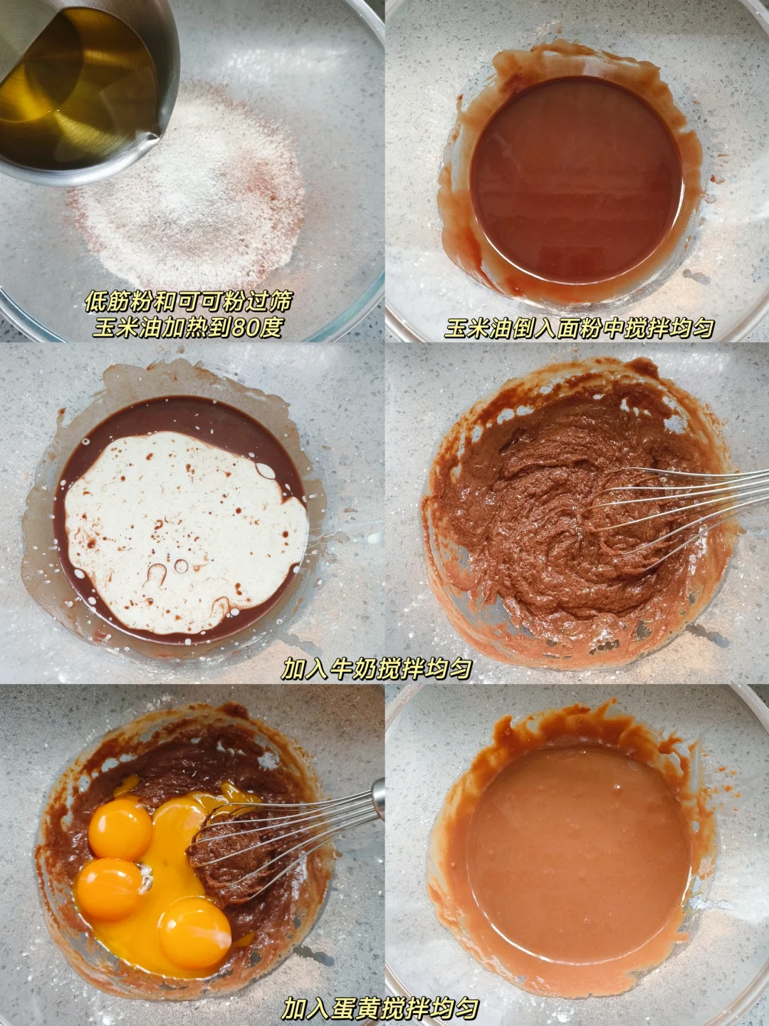 [一R]玉米油加热到80度,倒入提前过筛的低粉和可可粉中,搅拌均匀,加入牛奶搅拌均匀,再加入蛋黄搅拌顺滑。