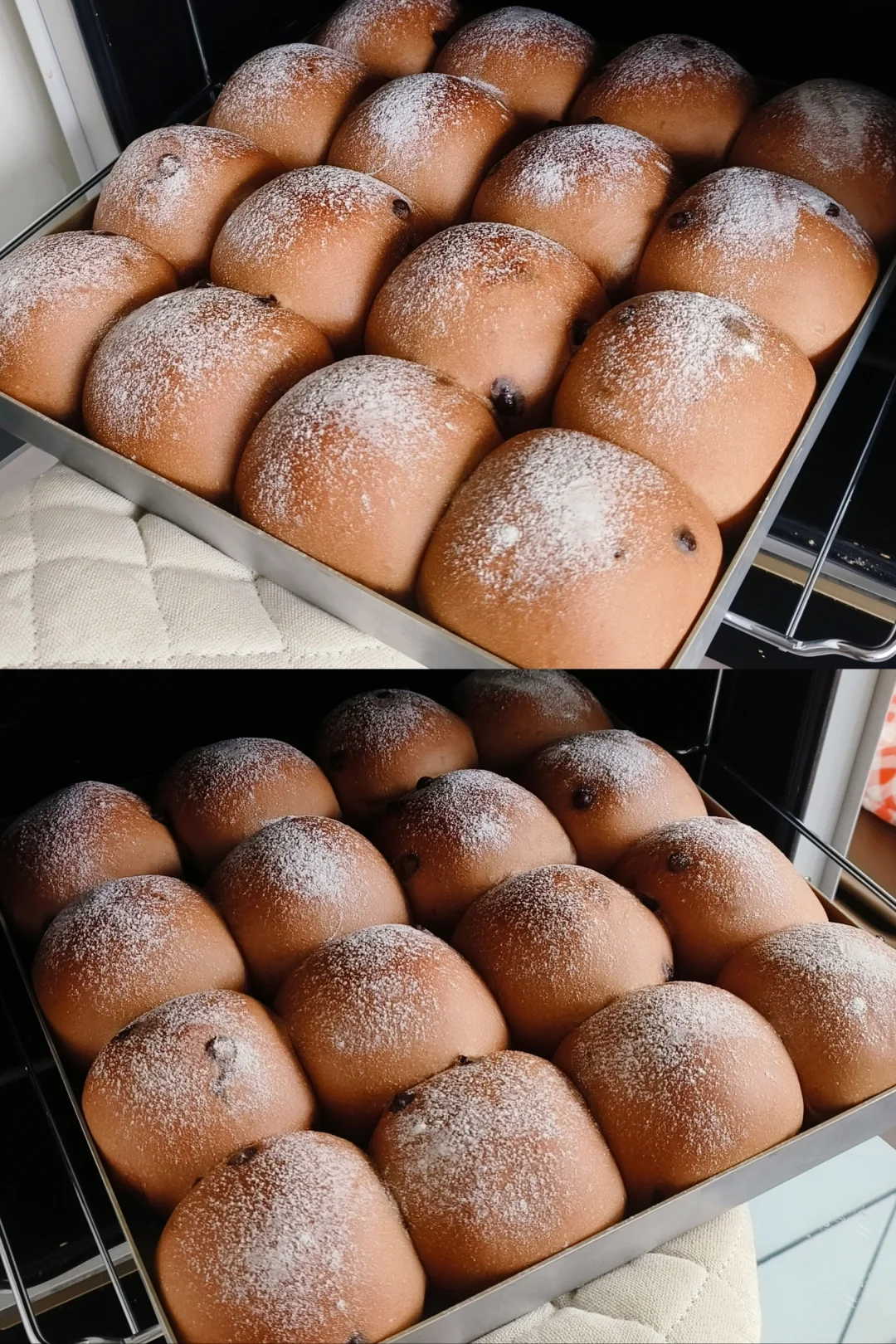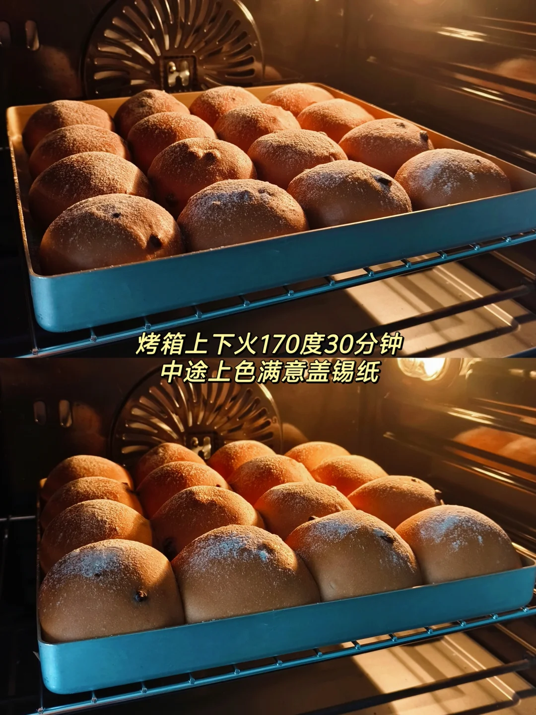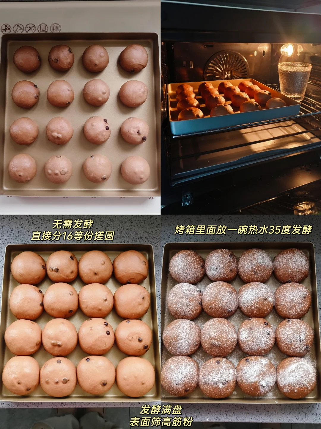[二R]面团无需松弛,直接分16等份,搓圆摆入烤盘,烤箱里加热水,35度发酵满盘,发酵好的面团表面筛高筋粉,烤箱上下火170度30分钟,上色满意加盖锡纸,出炉后震两下,晾凉密封保存