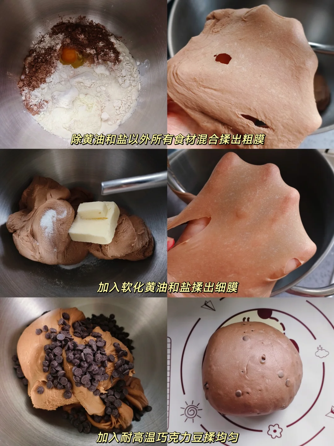 [一R]除黄油,盐以外所有食材混合揉出粗膜,加入软化黄油和盐继续揉出薄膜,加入巧克力豆揉均匀。