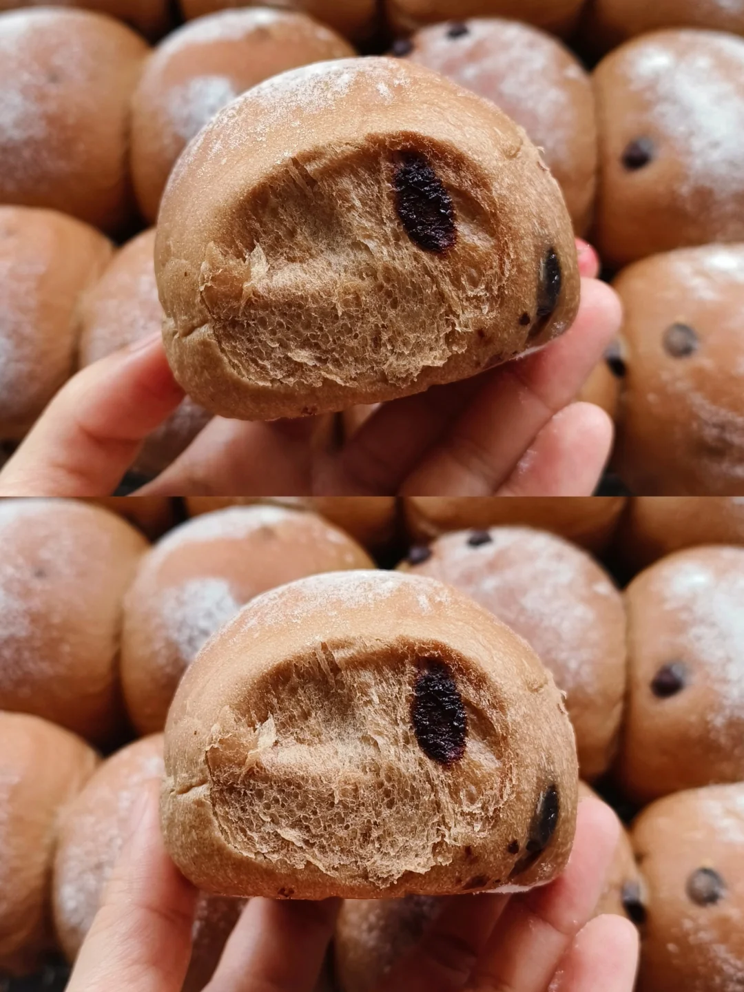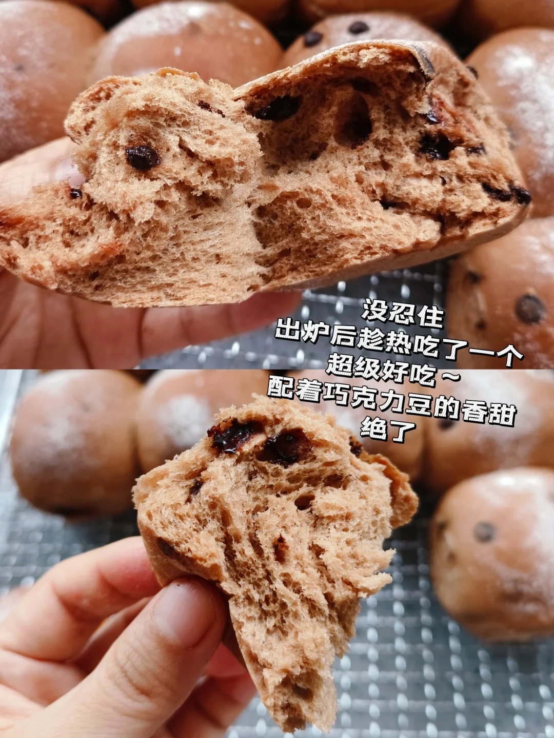 软fufu胖嘟嘟,松软的面包体,浓郁的巧克力香气配上香甜的巧克力豆,巨好吃~