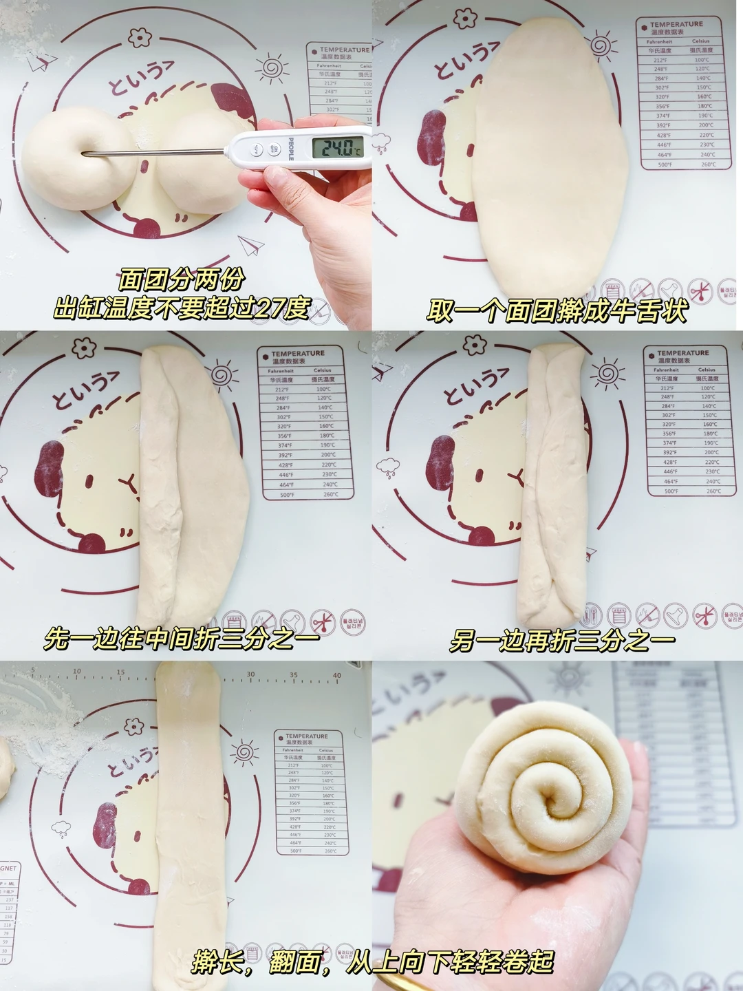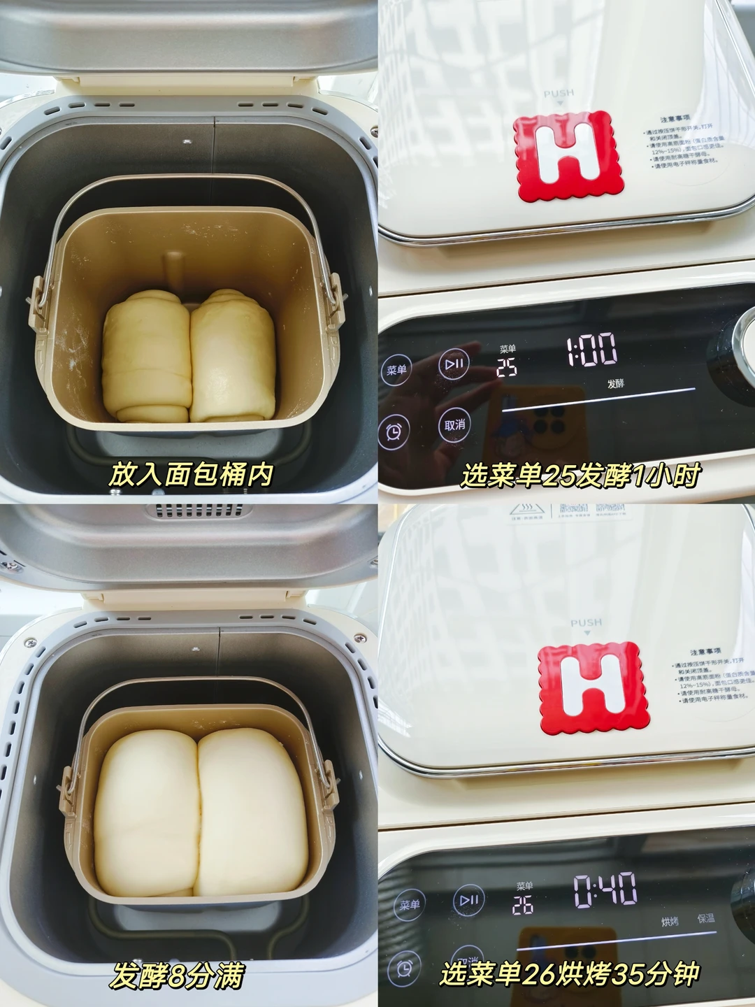 [三R]面团分两等份,取面团擀成牛舌状,如图两边往中间对叠,擀长,翻面,从上向下轻轻卷起,面包机选菜单发酵功能,发酵1小时8分满,选菜单烘烤模式烤35分钟即可。